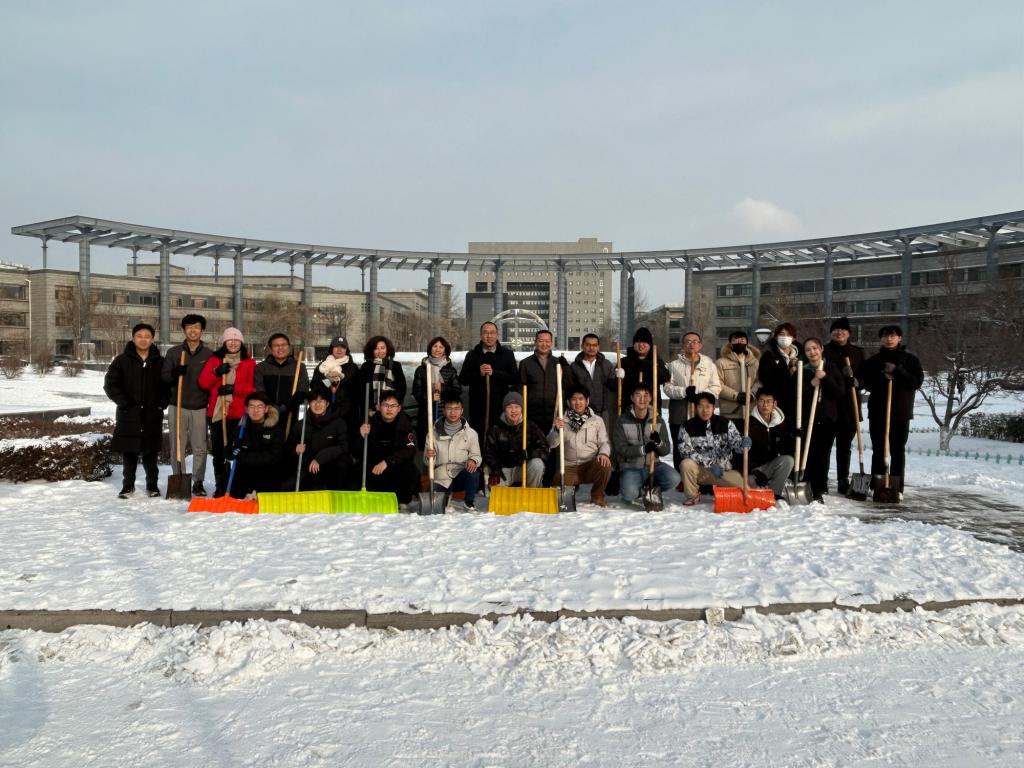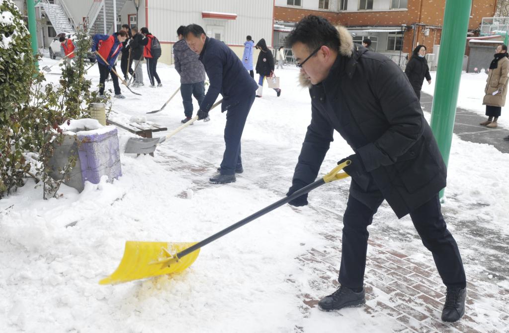 据介绍,学校后勤管理处在降雪开始不久便组织工作人员投入到融雪除雪工作中,对校园主干道路和学生生活区人员主要通行区域施撒融雪剂,对各楼宇台阶上的积雪进行清理并在门口铺设防滑垫。14日雪量加大,后勤员工顶风冒雪在全校范围进行清融雪工作;15日,精武镇环卫部门派铲车对学校主干道积雪进行清理,校园物业部工作人员及时将原有和新购置的300余把铁锨和200余把除雪铲送至集中地点,供师生除雪使用。目前,后勤员工和精武镇环卫清雪车辆还在校园内各通行道路进行清融雪作业,各条道路已基本疏通,收尾工作仍在有序进行中。