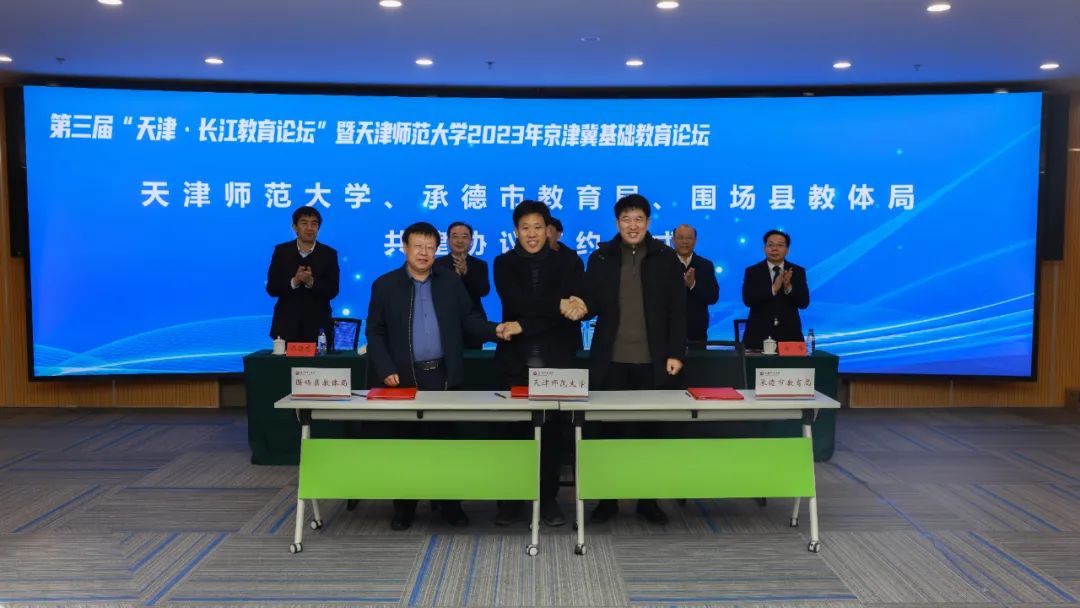 太阳城集团官方网站、河北省承德市教育局、围场满族蒙古族自治县教育和体育局签订共建合作协议。三方将以教师教育改革实验区建设为纽带,充分发挥各自优势,围绕新时代基础教育高质量发展的目标和要求,集聚创新资源、做强教育共同体、推进深度融合发展,携手绘就津冀基础教育协同发展的新篇章。