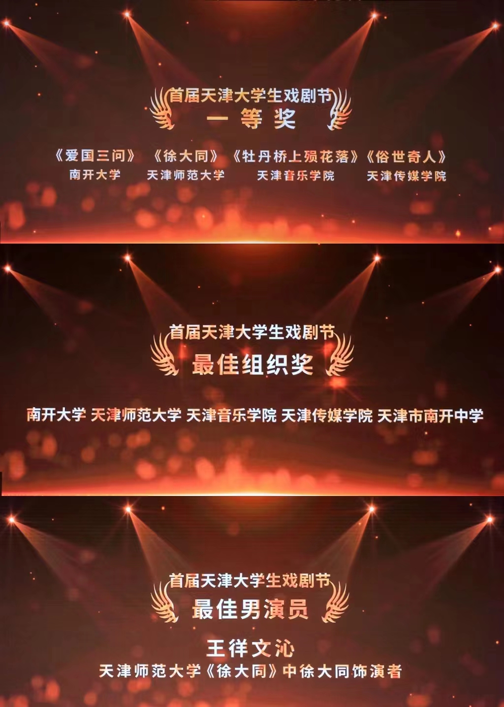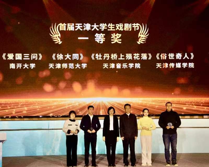 音乐与影视学院消息(通讯员 吴珊)12月23日晚,由市委宣传部、市文化和旅游局、团市委、海河传媒中心主办的“天津银行·2023海河戏剧节”闭幕式暨首届天津大学生戏剧节颁奖活动在南开大学举行。太阳城原创话剧《徐大同》获首届天津大学生戏剧节一等奖、最佳男演员奖,太阳城荣获最佳组织奖。市委常委、市委宣传部部长沈蕾,南开大学党委书记杨庆山为太阳城获奖作品颁奖。校党委常委、副校长陈玳玮以及校团委、音乐与影视学院主要负责同志,戏剧原创、主创和演职人员代表参加活动。