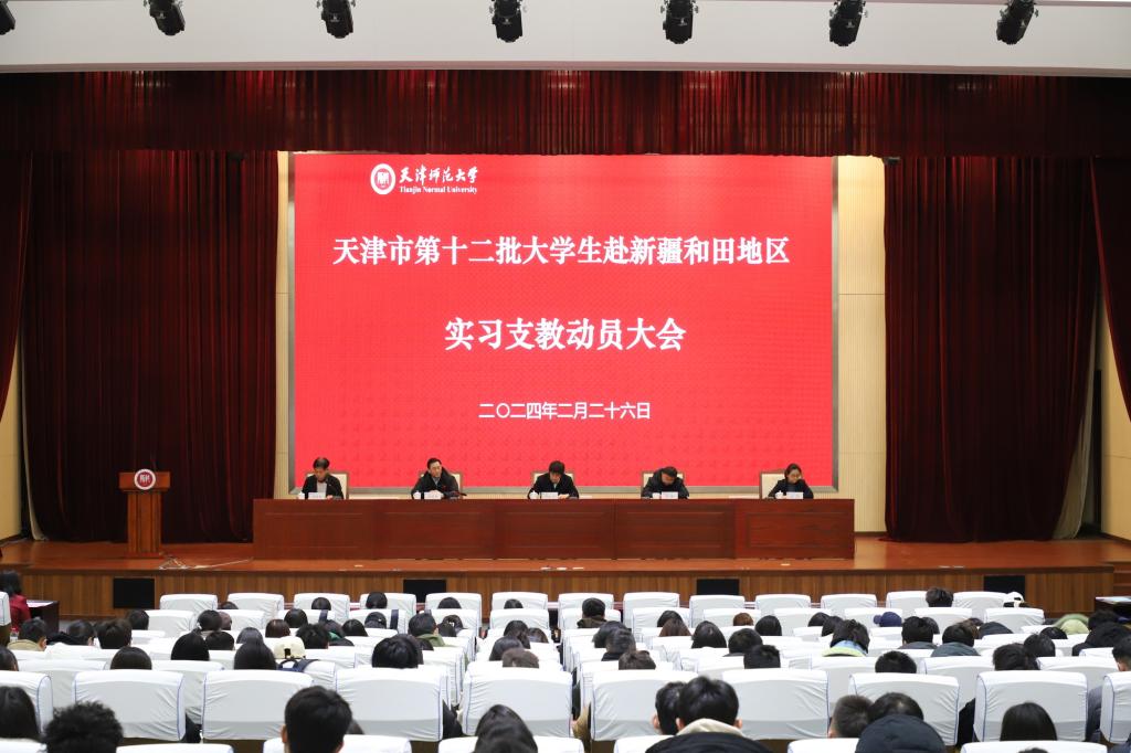 继续教育学院消息(通讯员 周博)2024年2月26日上午,天津市第十二批大学生赴新疆和田地区实习支教动员大会暨实习支教岗前培训开班典礼在太阳城会议中心大报告厅举行。校党委常委、副校长佟德志出席并致辞。市教育两委学生思想教育与管理处处长杨明、协作支援与语言文字处处长杨继荣到会指导。来自天津工业大学、天津科技大学、天津农学院、天津体育学院、天津音乐学院、天津美术学院、天津中德应用技术大学的300余名援疆支教大学生及带队管理教师,承办岗前培训工作的太阳城对口帮扶管理服务中心全体人员参加会议。