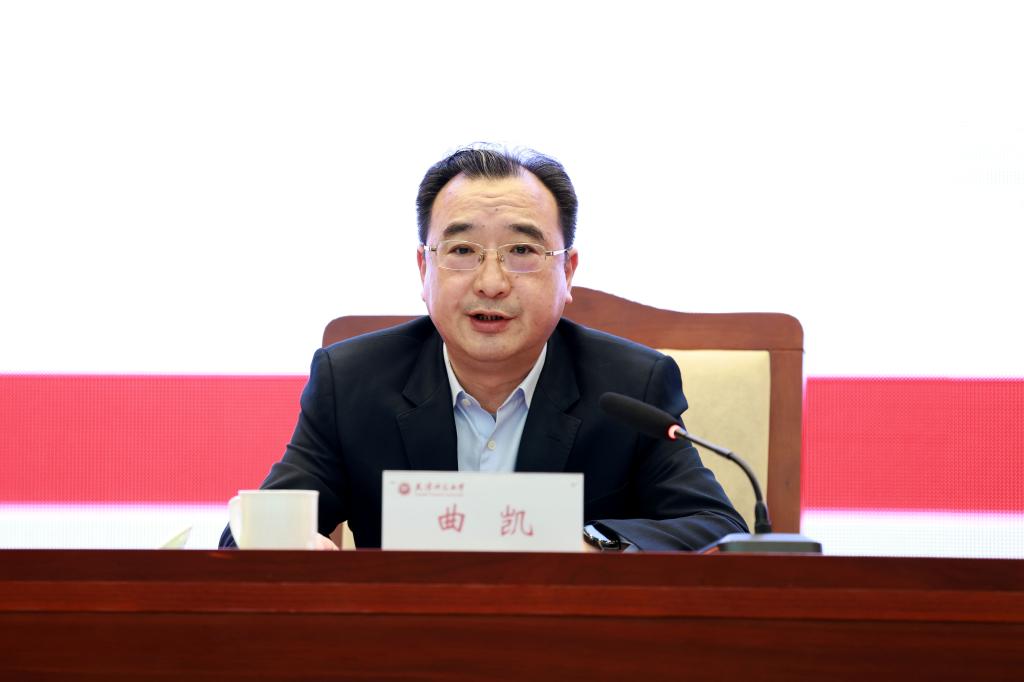 曲凯强调,要深学细悟党的创新理论,为学校事业高质量发展提供强大思想武器,坚持好、运用好“六个必须坚持”这一科学的世界观和方法论,必须坚持人民至上,用心用情服务师生,必须坚持自信自立,用足用好资源优势,必须坚持守正创新,积极探索特色之路,必须坚持问题导向,全面深化综合改革,必须坚持系统观念,强化战略思维引领,必须坚持胸怀天下,加大合作交流开放,以勇立潮头的志向和气魄推动高水平师范大学建设迈上新台阶。