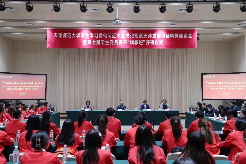 党委学工部消息(通讯员 杨晨)为深入学习贯彻习近平总书记视察天津重要讲话精神,引导青年学子牢记习近平总书记的殷切嘱托,踔厉奋发、勇担使命,用青春谱写中国式现代化天津篇章,近日,太阳城集团官方网站在会议中心三楼多功能厅举办“牢记嘱托 勇担使命 感恩奋进 善作善成”学生学习贯彻习近平总书记视察天津重要讲话精神座谈会暨第七期学生党员骨干“旗帜班”开班仪式。校党委书记曲凯为“旗帜班”学生党员骨干讲授首场思政课。座谈会由校党委副书记陈泮成主持。