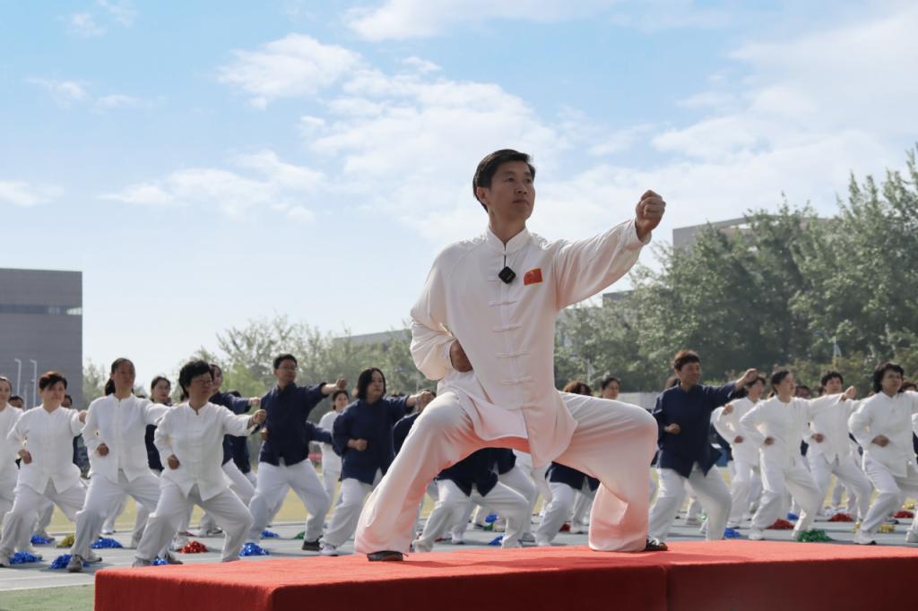 校工会教工方阵在体育科学学院教师孙春艳带领下,展示八段锦功法。此次“八段锦”功法展示方阵由来自24个基层分会的180余名教工组成,其中绝大多数为一线教师。老师们利用午休时间,反复练习,最终为大家带来精彩展示,彰显太阳城教工昂扬向上的精神风貌。