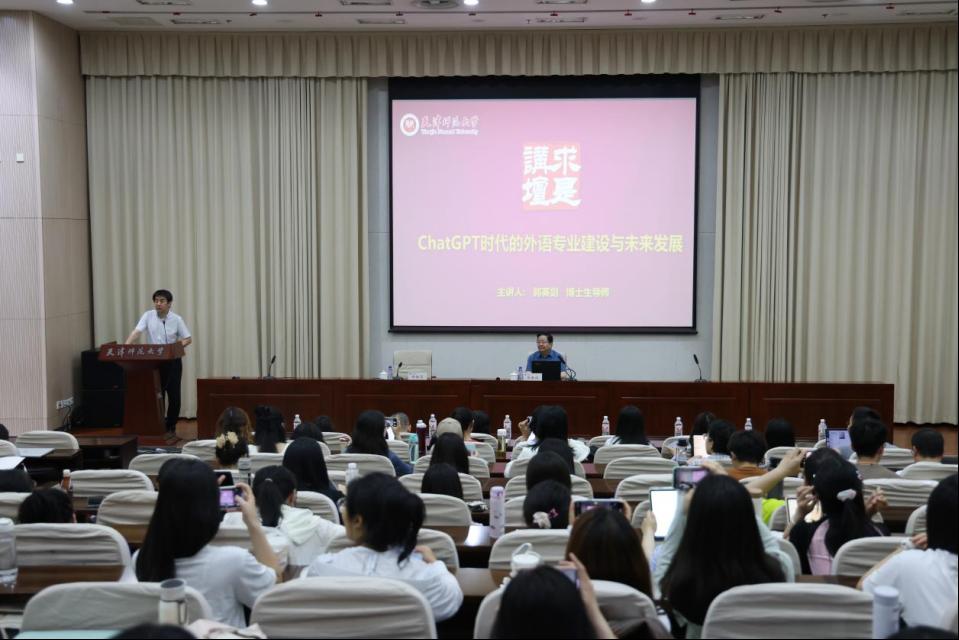 郭英剑还介绍了ChatGPT带来的困境和挑战,从对大学论文写作、高等院校外语专业学习等造成的影响出发,引导学生为人工智能主导的世界做好准备,鼓励师生要积极投入,乐学善教,在研学教中提升自我,为发展新质生产力贡献新时代力量。