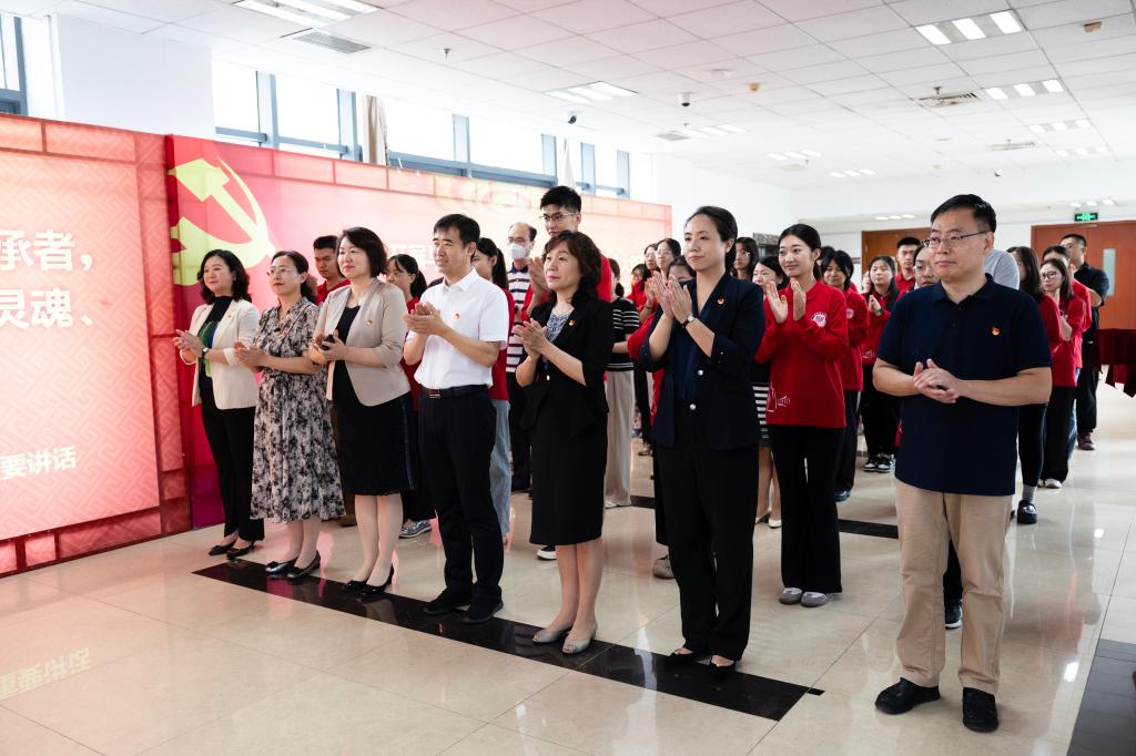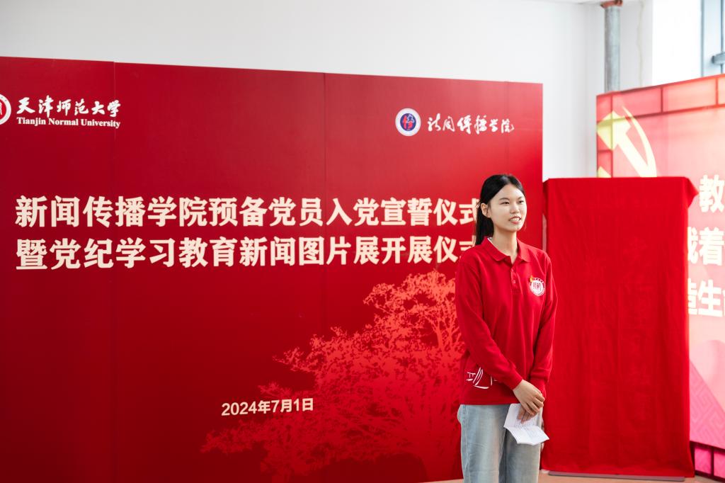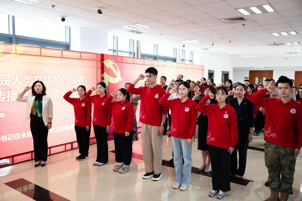 入党宣誓仪式在雄壮的《国际歌》中拉开帷幕。与会领导为预备党员代表佩戴党员徽章。新闻传播学院党委书记张家玥带领新党员进行入党宣誓,全体党员重温入党誓词。