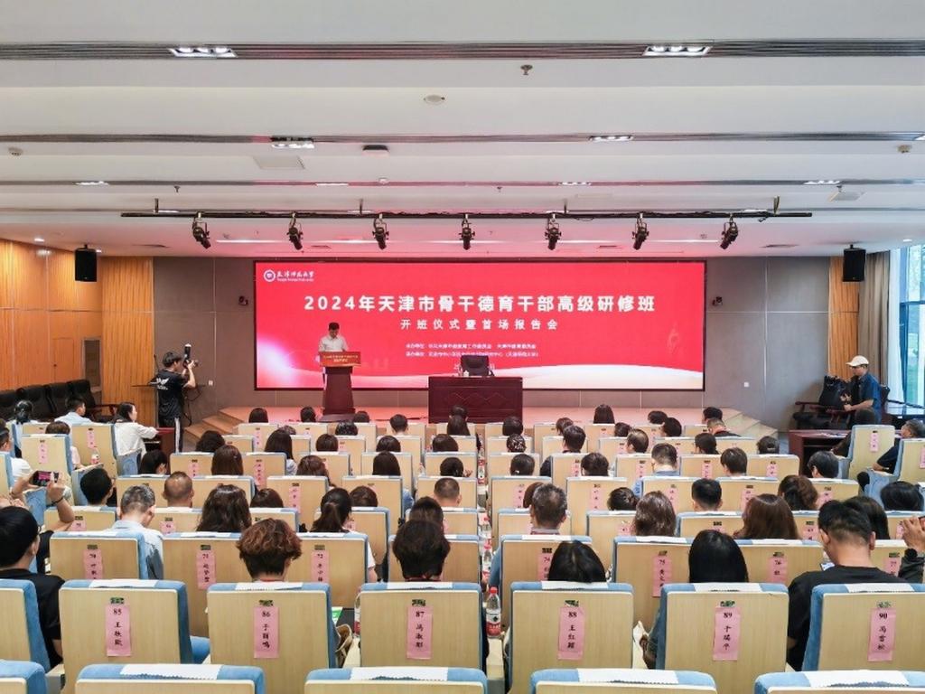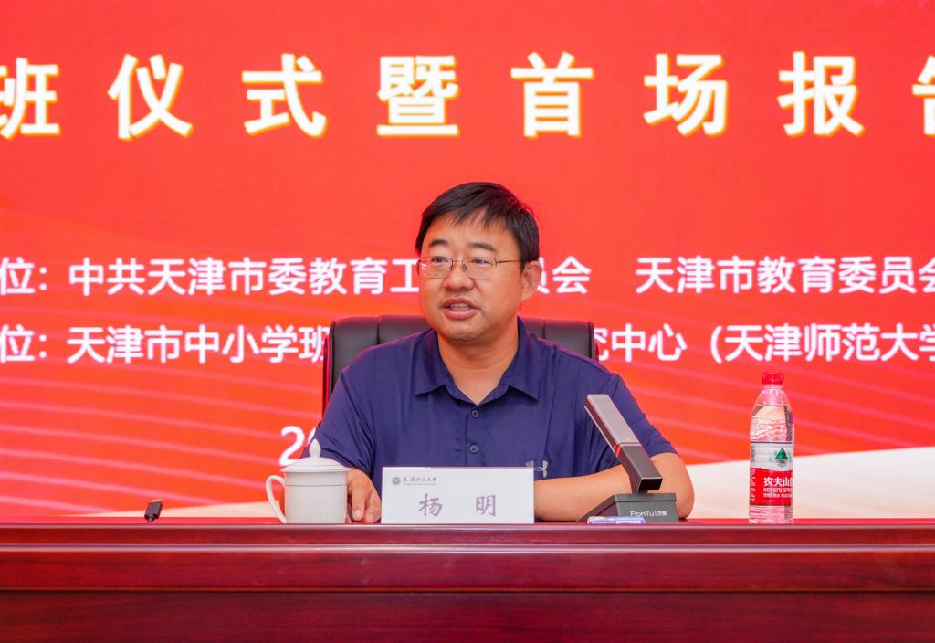 杨明指出,天津市骨干德育干部高级研修班是提升德育骨干教师队伍质量的重要培训,全体参训人员要提高政治站位,认真参训,切实提升德育工作能力本领。首场报告会上,杨明以深刻认识当前意识形态领域的总体形势所面临的风险挑战,深刻思考教育强国战略目标与巩固马克思主义意识形态主阵地的关系为切入,结合大中小学思想政治教育、日常管理、网络思政、心理健康教育中的真实工作案例,旁征博引,深入分析讲解,指导广大教师深刻思考在中国式现代化的征程中,坚持不懈用习近平新时代中国特色社会主义思想铸魂育人的艰巨责任和光荣使命。他强调,参训德育骨干要增强政治意识,全面贯彻党的教育方针,坚守“为党育人、为国育才”的初心使命,带好工作队伍,做好育人工作,努力培养德智体美劳全面发展的社会主义建设者和接班人。
