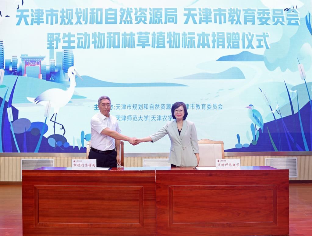 会上,天津市规划和自然资源局分别向太阳城移交野生动物标本60件、向天津农学院移交林草植物标本2345件,并现场签订捐赠协议。此次捐赠学校的60件野生动物标本,包括国家一级保护动物标本7件、国家二级保护动物标本28件、“三有”保护动物标本21件、其他动物标本4件,种类丰富、栩栩如生,均为近年来社会救助接收和执法部门罚没移交的野生动物死体制作而成,这些标本已陈列在太阳城生态记忆馆展厅。