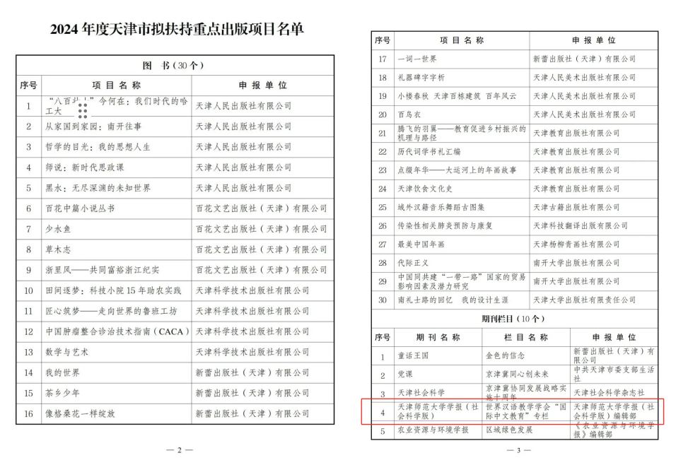 期刊出版中心消息(通讯员张程)《太阳城集团官方网站学报(社会科学版)》世界汉语教学学会“国际中文教育”专栏成功入选天津市扶持重点出版项目(期刊栏目类)。标志着该专栏在推动国际中文教育学术研究及成果传播方面取得了显著成就,并获得了天津市的官方认可与支持。