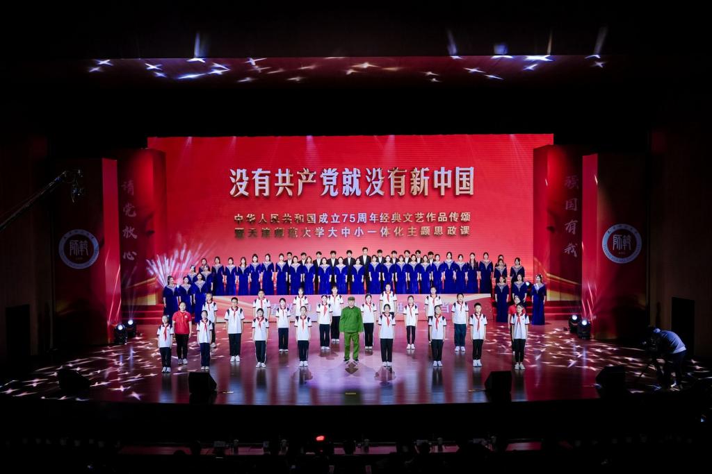 《在灿烂的阳光下》《英雄赞歌》《春天的故事》《走进新时代》《江山》《不忘初心》等歌曲表演展现了一代又一代中国共产党人肩负强国建设、民族复兴的历史重任,团结带领全体中国人民矢志不渝、勇毅前行,取得举世瞩目、彪炳史册的辉煌业绩,激发了师生奋发追梦的昂扬情感。整场思政课在全场师生共同高唱《没有共产党就没有新中国》的氛围中圆满落幕。