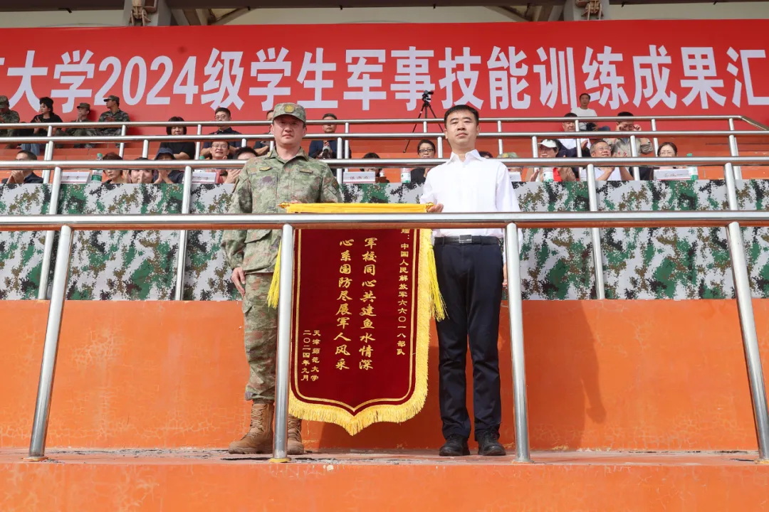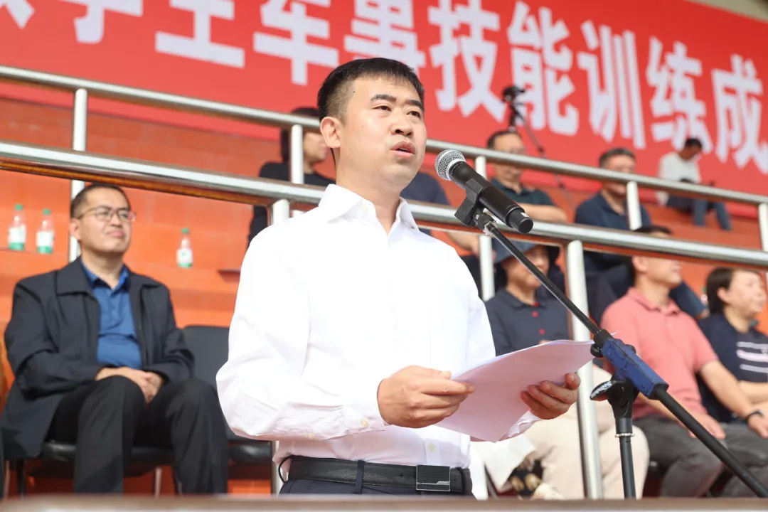 陈泮成代表学校向承训部队全体教官、向太阳城退役大学生教官表达了诚挚敬意,对全校上下的合力付出表示衷心感谢,同时祝贺2024级学生圆满完成了军训任务。他指出,军训是大学的第一节必修课,锻炼的是躯体,磨炼的是意志,训练的是作风,弘扬的是精神,熔铸的是理想。在军训过程中,同学们深刻体验到了军人的奉献精神与责任担当,体会到了团队协作的力量,也感悟到了在严苛条件下坚持不懈的意义。他强调,同学们要以军训为起点,继承和发扬部队的优良传统和作风,争做有理想、敢担当、能吃苦、肯奋斗的新时代好青年,为实现中华民族的伟大复兴贡献青春力量!