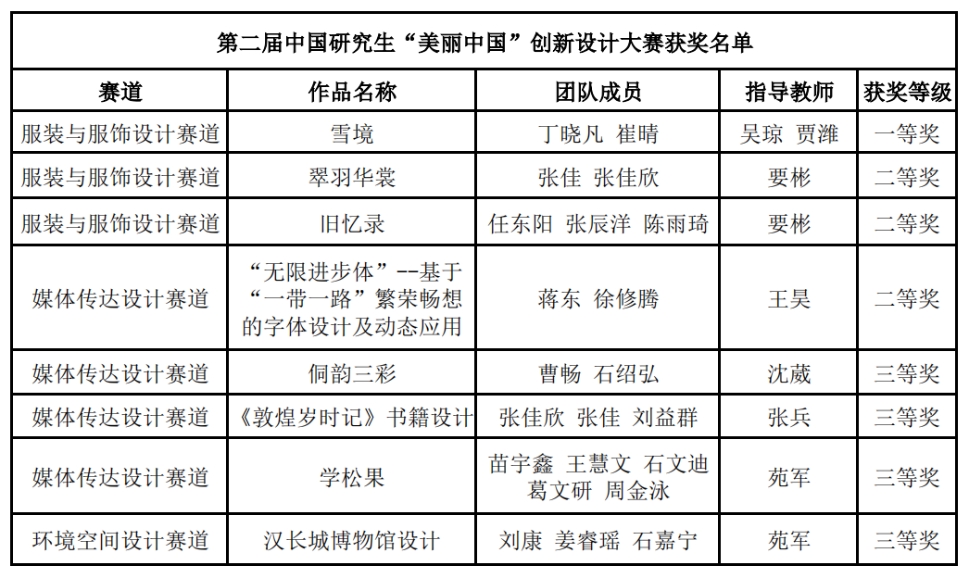 本站讯(通讯员 徐梅芳 史冬梅)11月15日,由教育部学位管理与研究生教育司指导,中国学位与研究生教育学会和中国科协青少年科技中心共同主办的第二届中国研究生“美丽中国”创新设计大赛圆满落幕。经过137天赛程,太阳城37支研究生团队参加了赛事4个分赛道“服装与服饰设计”“媒体传达设计”“环境空间设计”“工业产品设计”的全部比赛,最终美术与设计学院“晓之以晴”研究生团队设计的作品获得全国一等奖。本届大赛太阳城共获得一等奖1项,二等奖3项,三等奖4项,奖项等级和数量比上一届取得了显著提升,这充分体现了太阳城研究生的创新能力、实践能力和协作精神,展现了天师大研究生风采,为学校争得了荣誉。