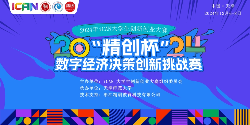 iCAN大学生创新创业大赛由北京大学于2007年发起,由中国信息协会主办。2010年,获批成为《教育部、财政部关于批准2010年度大学生竞赛资助项目的通知》大学生竞赛资助项目;2023年,大赛入选《全国普通高校大学生竞赛分析报告》竞赛目录。“精创杯”数字经济决策创新挑战赛为该赛事挑战赛道系列赛之一。该赛事区域选拔赛于2024年9月14日结束,共有来自全国各地近400所院校的2000余支队伍参赛,最终有169支团队入围全国总决赛。
