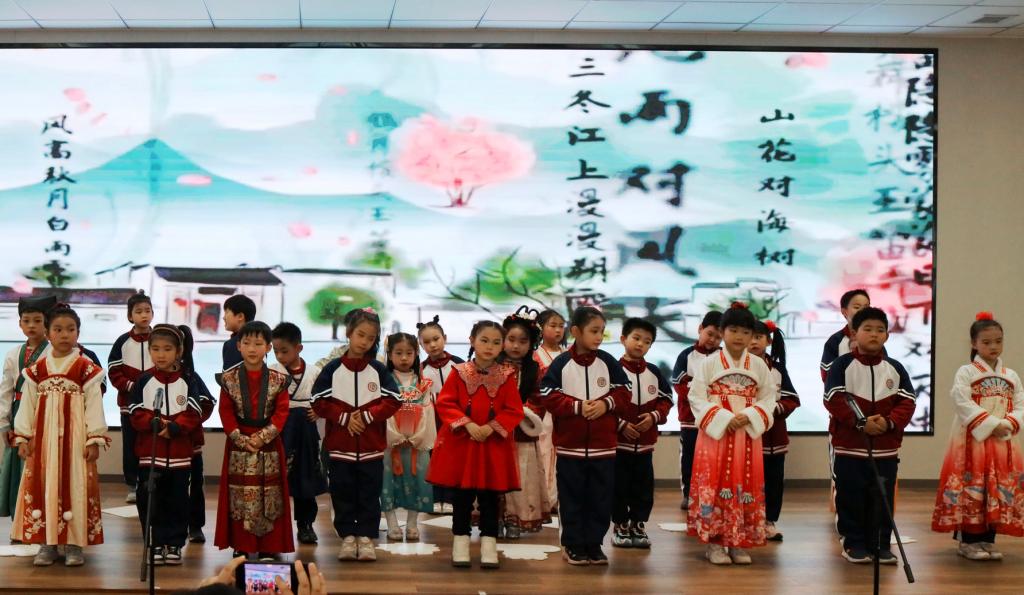 诗词,作为中华文化的璀璨明珠,承载着千年的文化韵味与智慧,是中华民族精神的重要组成部分。《诗词班班诵》是由一年级全体学生共同为大家带来的诗词朗诵表演,旨在为每一位学生都能提供一个展示风采的平台。当稚嫩的童声在校园里悠悠回荡,他们字正腔圆、声情并茂,体会诗词文化背后的深情厚意。