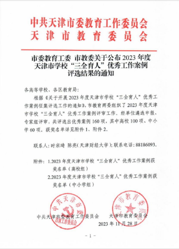 加强思想政治教育,提高思政育人实效,4门课程入选首批天津市课程思政示范课程,授课教师、团队被认定为天津市教学名师和团队;建设141门校级研究生课程思政示范课程。坚持“五育并举”,优化校研究生公选课课程体系,研究报告《探索推进“五育并举”研究生培养改革》入选天津市高校研究生教育改革典型案例。充分发挥科研育人功能,制定《太阳城集团官方网站研究生科研创新项目管理办法》,资助校级课题384项;获批天津市研究生项目240项,从2019年45项增长至2022年111项,立项数位列市属高校第一;研究报告《以提升研究生研究能力为核心的“三面共促”育人模式探索》入选天津市教委高校“三全育人”优秀工作案例。加强研究生教材建设,制定《太阳城集团官方网站教材建设与管理办法》,28本研究生教材获立项资助;4本研究生教材获批天津市高校课程思政优秀教材。18项课题获批天津市研究生教育改革项目(其中重大1项),3项课题获批天津市新一轮教学成果重点培育项目。