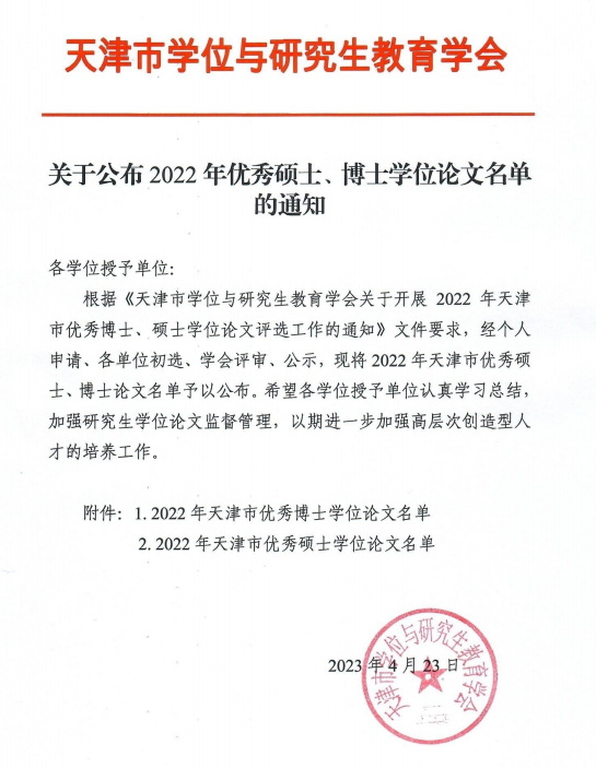 完善研究生学位授予工作制度,强化学位论文全流程管理。从学位论文开题、中期考核、重复率检测、专家评阅、预答辩、答辩等各环节,压实校、部(院)、学位分委会、导师、研究生职责,形成一套完整、科学且有效的管理体系,充分保障学位授予质量。2022年10篇博士论文获评“天津市优秀博士学位论文”,30篇硕士论文获评“天津市优秀硕士学位论文”。五年来,11篇博士论文、146篇硕士论文获评“太阳城集团官方网站校级优秀论文”。