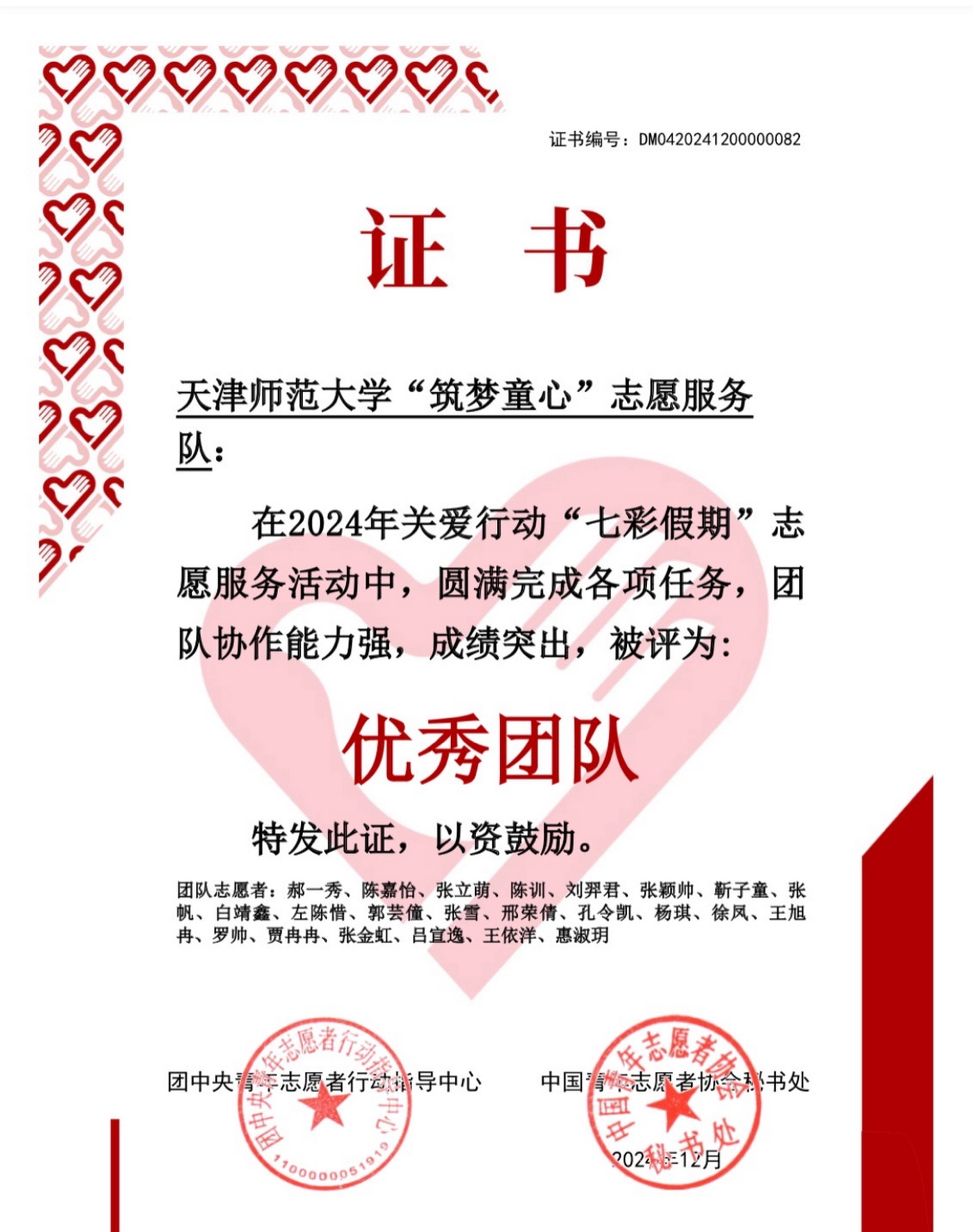 本站讯(通讯员 武梦玮)近日,团中央青年志愿者行动指导中心、中国青年志愿者协会秘书处公布了2024年关爱行动“七彩假期”志愿服务活动优秀团队名单,太阳城“筑梦童心”志愿服务队从全国2000支队伍中脱颖而出,获评“优秀团队”。