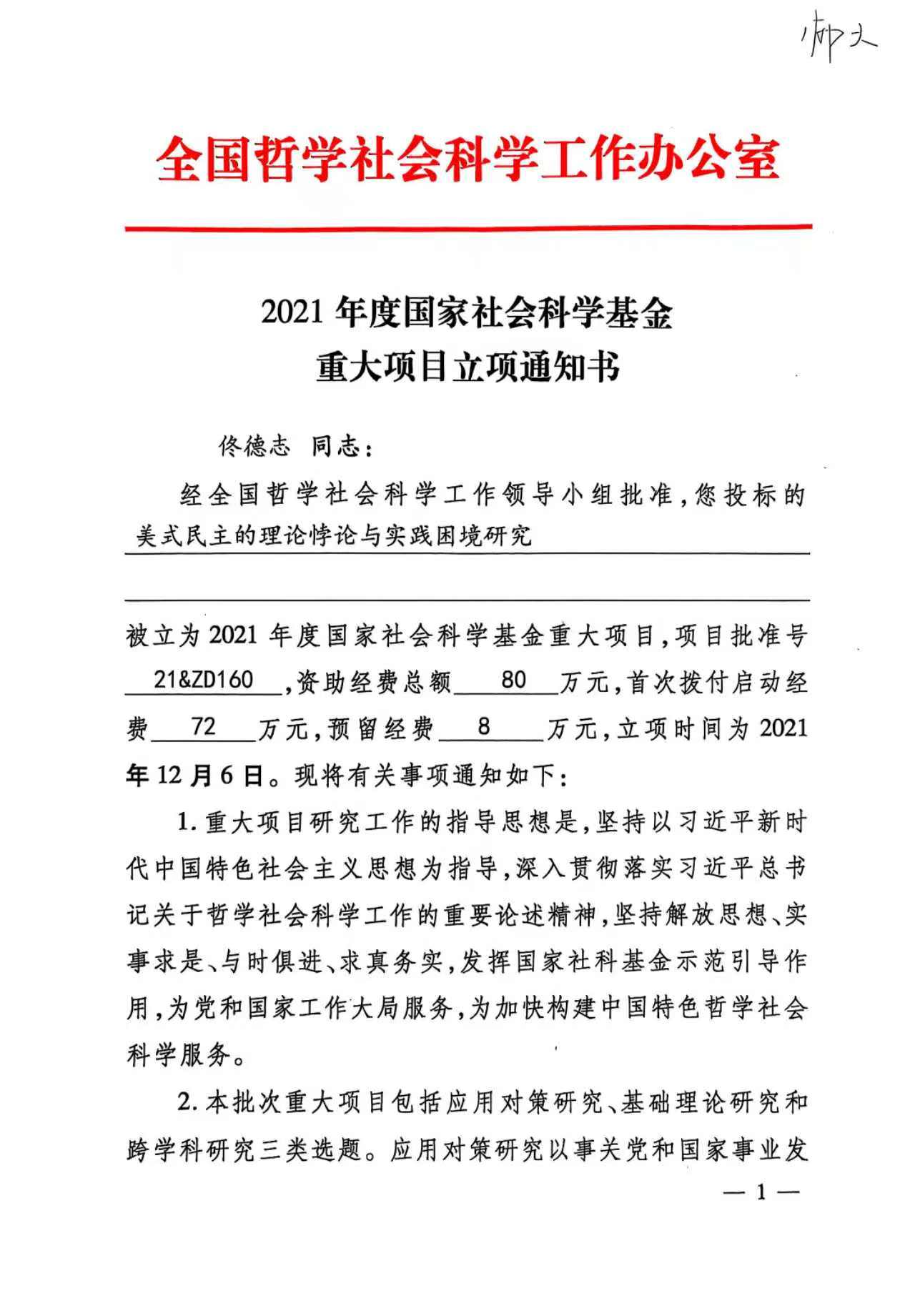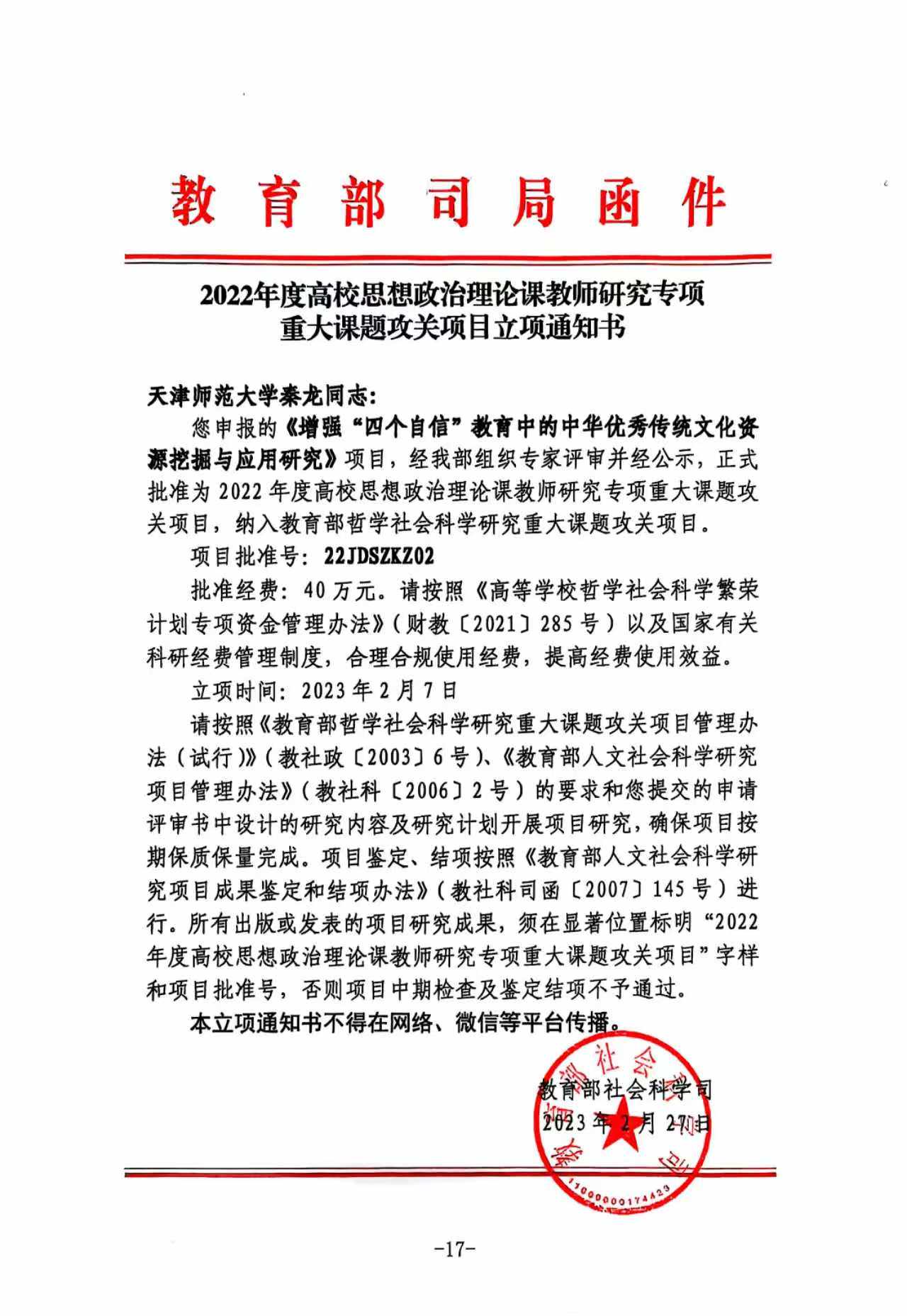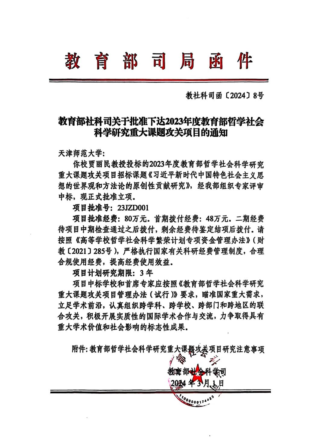 学校坚持马克思主义在哲学社会科学领域的指导地位,不断强化有组织科研,持续开展高水平项目培育,助力推出一批研究阐释党的创新理论、服务国家重大战略、构建中国特色哲学社会科学、传承创新中华优秀传统文化的科研项目。五年来,学校累计获批各类人文社会科学项目(含横向项目)1563项,科研经费总计11923.29万元。其中,获批国家社会科学基金重大招标项目8项、教育部人文社科重大课题攻关项目2项、国家社会科学基金重点项目12项、其他各类国家社会科学基金项目156项,1项成果入选《国家哲学社会科学成果文库》;获批教育部人文社会科学研究基地重大项目4项、教育部人文社会科学研究项目116项(其中重点项目8项);获批天津市哲学社会科学规划项目403项(其中重点项目101项)、天津市教育科学规划项目41项(其中重点项目13项)、天津市艺术科学规划项目34项。此外,太阳城还获批最高人民检察院、最高人民法院、司法部、国家统计局、国家民族事务委员会、住房和城乡建设部、国家体育总局、国家语委等项目23项。学校立项横向课题450项,科研经费共5402.83万元。