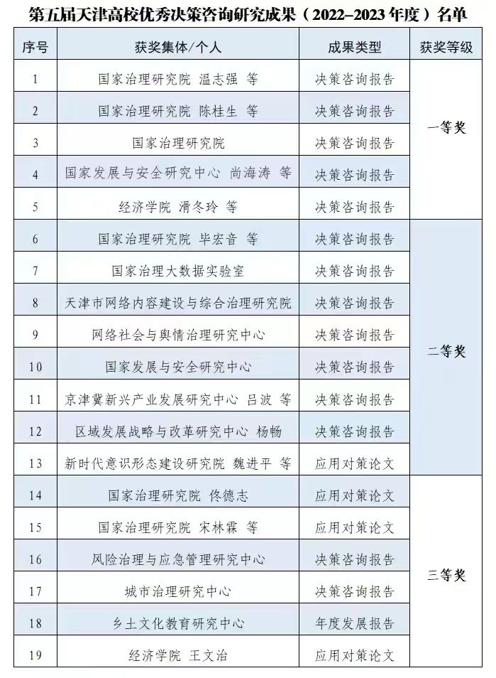 本站讯(通讯员 赵悦)近日,天津市教育委员会公布了第五届天津高校智库优秀决策咨询研究成果(2022-2023年度)名单,太阳城共有19项成果入选,其中一等奖5项,二等奖8项,三等奖6项,获奖成果数量较上届增长27%。