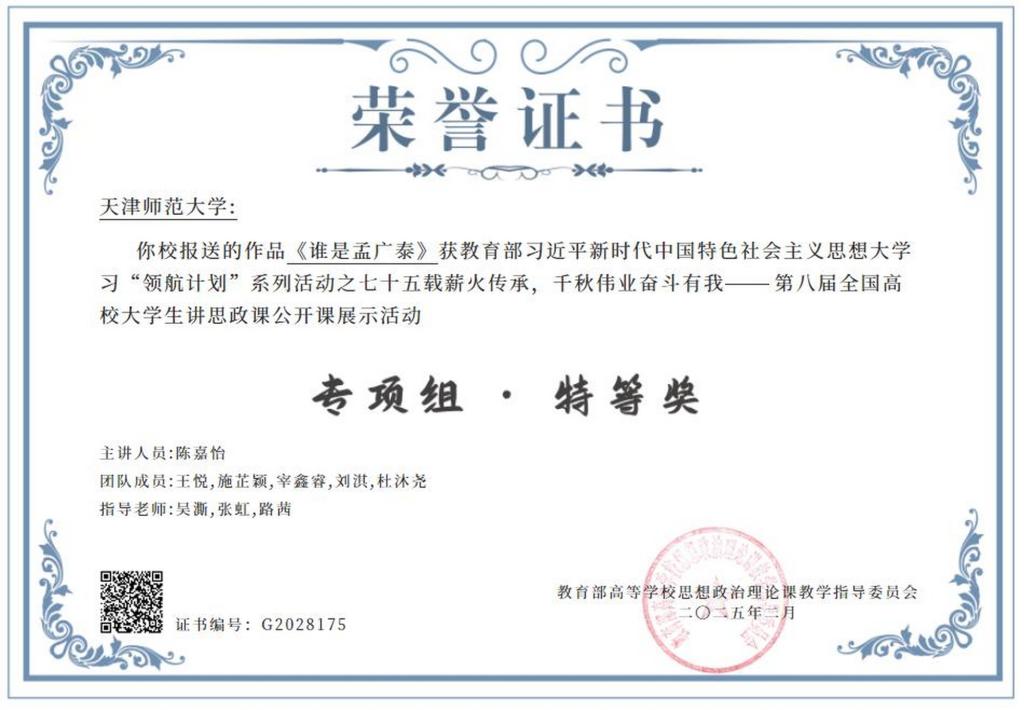 本站讯(通讯员 金明昊)近日,第八届全国高校大学生讲思政课公开课展示活动获奖名单公布。由马克思主义学院教师吴澌,教育学部教师张虹、路茜指导的陈嘉怡团队(团队成员:王悦、施芷颖、宰鑫睿、刘淇、杜沐尧)的参赛作品《谁是孟广泰》,在全国1339所高校提交的5007部参赛作品中脱颖而出,斩获特等奖。