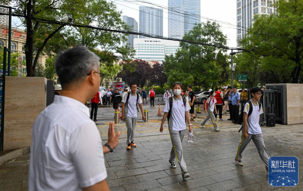↑9月1日,天津一中学生走进校园与教师打招呼。