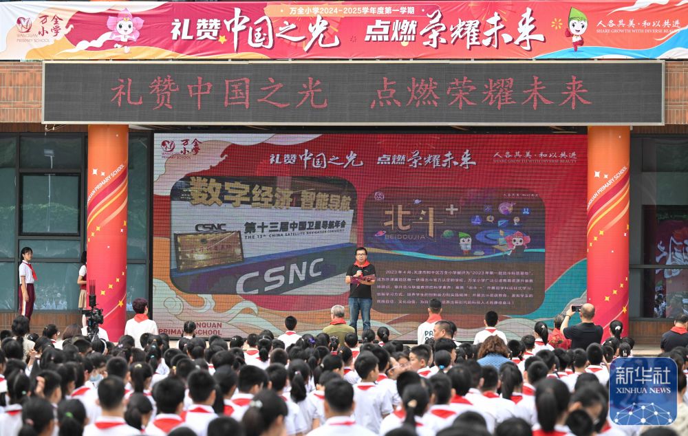 ↑9月1日,在天津市和平区万全小学,南开大学教授李国强为学生们普及科学知识,寄语学生。
