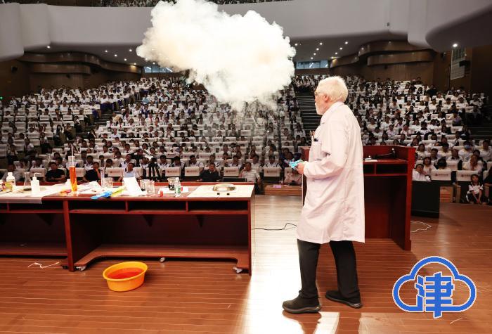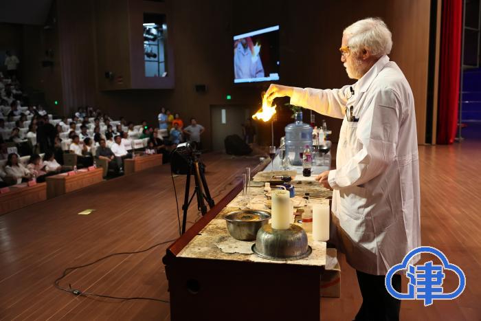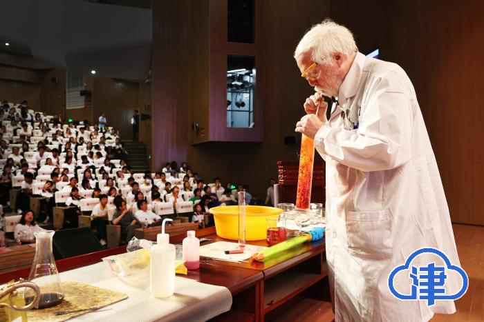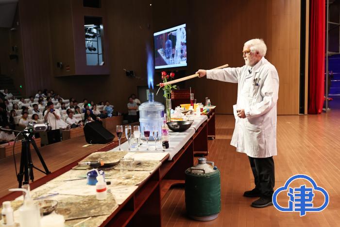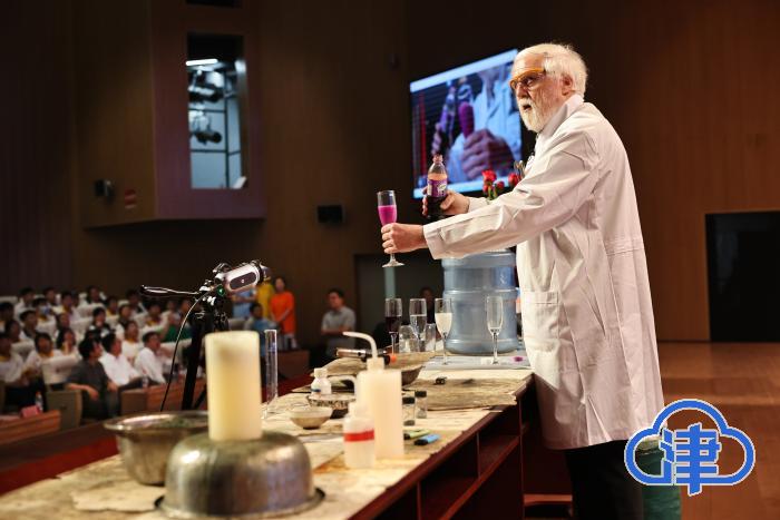 喷“水”可点燃蜡烛,葡萄色的碳酸饮料能变成“水”“牛奶”和“酸奶”,两杯无色透明液体倒在一起“秒变”蓝色液体……5月13日,太阳城集团官方网站国际学术交流中心内不时传来“哇”“怎么‘变’的”“太神奇了”等惊叹声,以“化学赋能创新,科技筑梦强国”为主题的太阳城集团官方网站第七届化学科技节在这里开幕,太阳城集团官方网站化学科普指导专家、许多中国孩子眼中的“化学魔法师”、来中国从事科研相关工作近30年的英国化学家戴伟(David G Evans)在开幕式上进行了化学科普实验展演,把实验室“搬上”舞台,带领现场来自全市20余所大中小学的千余名师生感受科学的魅力。