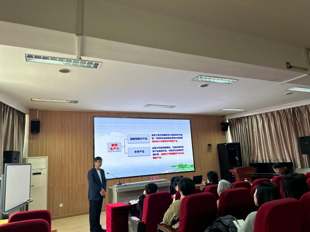 李勇结合经济研究的理论基础和实践经验,从高质量发展需要新质生产力理论指导、新发展阶段发展新质生产力的决策部署两个方面作了系统全面、深入浅出的讲授;对什么是新质生产力、为什么要发展新质生产力、如何发展新质生产力做了详细的阐述,对于“新”与“质”,分别从“新劳动者、新劳动对象、新劳动工具、新型基础设施”和“质态、质效”等方面解释了其内涵。结合天津实际,盘点了产业优势和发展方向,他强调,新质生产力是先进的生产力,特点在于创新,其发展要依靠创新科技、创新人才,归根结底还是要创新教育。高校和职业院校要充分结合实际情况,在学科设置、人才培养模式、创新发展等方面发挥重要作用。