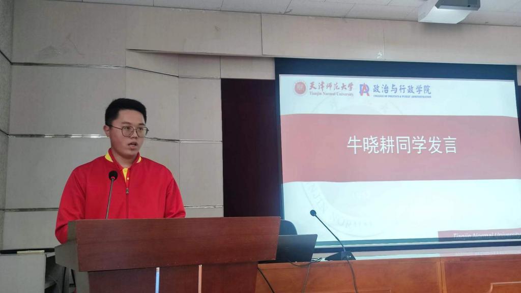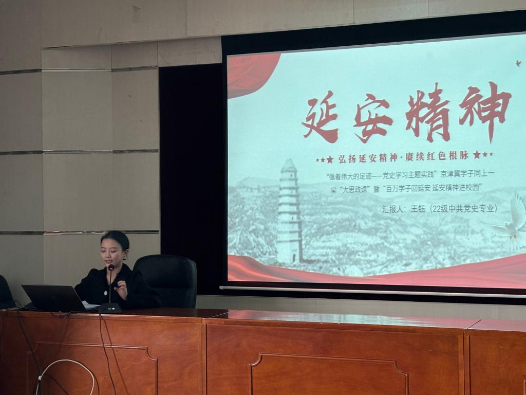 王钰用一幅幅图片向大家详细介绍了本次研学活动,与在座师生共同感受毛主席等老一辈革命家在延安住窑洞、吃粗粮、穿布衣,艰苦奋斗、自救自强,用“延安作风”打败了“西安作风”的光荣历史。共同学习习近平总书记在梁家河为老百姓建沼气池、买磨面机,为民造福、追求真理、埋头苦干的精神。牛晓耕分享了他参加研学团的学思感悟,表示参加研学团既是一种荣誉也是一种激励,作为一名高校学生应当挖掘延安精神蕴含的内涵价值,在科研探索、理论研究中坚持自力更生、艰苦奋斗,在将小我融入大我、青春投身基层的伟大实践中全心全意为人民服务。