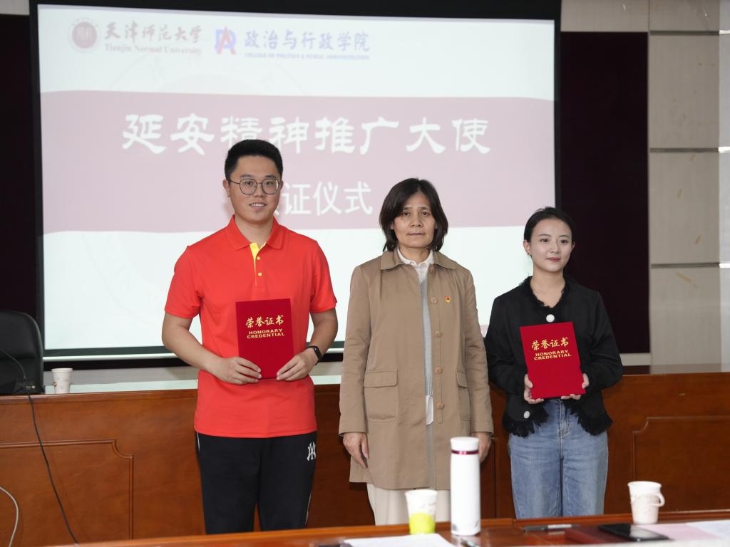 姜德红为牛晓耕、王钰颁发“延安精神宣讲员”聘书,希望他们充分发挥学院学生理论宣讲团优势,深入研究、传承、践行好延安精神,争当弘扬延安精神的排头兵、领头雁。
