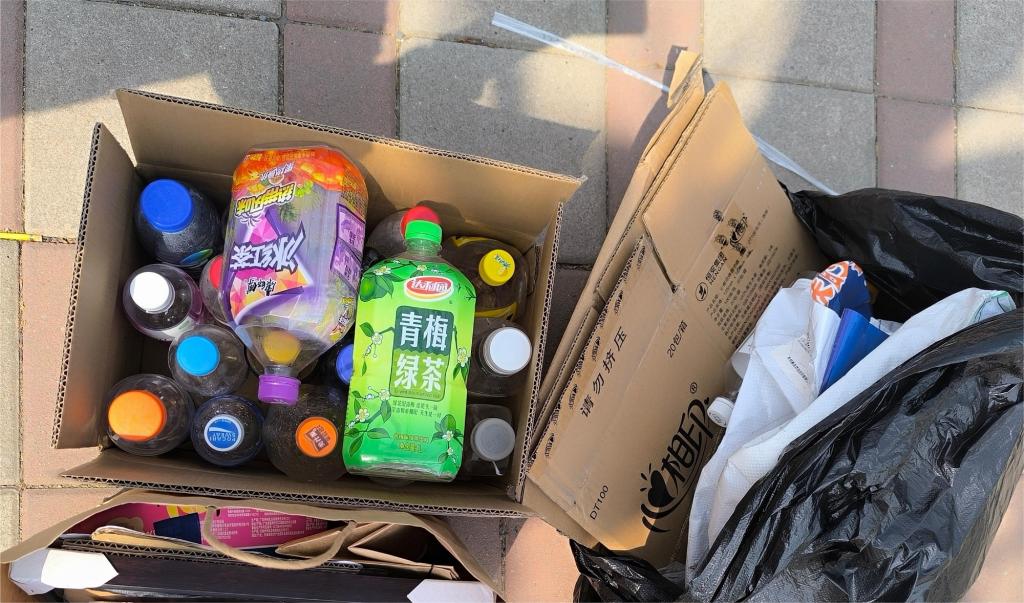 废物收集区,同学们将使用过的塑料瓶、纸箱、废旧纸张带来现场,投放到相应的回收区域。