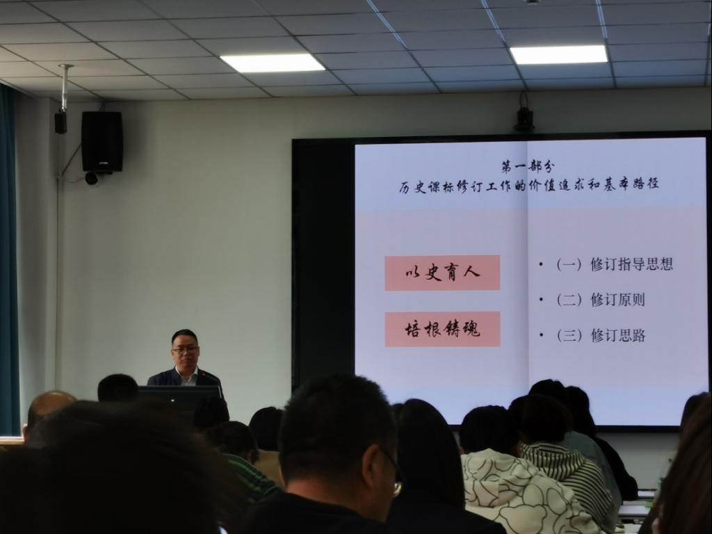 王玉亮作了题为“以义务教育历史课标(2022年版)为指导持续改进历史教学”的主题报告,报告详细介绍了大中小历史教育教学一体化情况,解读了不同阶段教育教学的目标要求,并以具体实例生动展现了初中历史教育教学的严谨性、科学性。