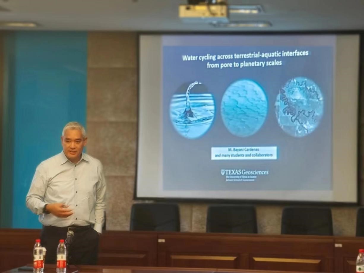 M. Bayani Cardenas教授以《Water cycling across terrestrial-aquatic interfaces from pore to planetary scales》为题作了报告,介绍了不同尺度上河流-潜流带-含水层中物理与化学过程以及跨尺度模拟,特别是不同尺度下(自孔隙尺度到大陆尺度)水循环过程机制,地表水-地下水相互作用,及其对流域水质和近海水环境的影响。