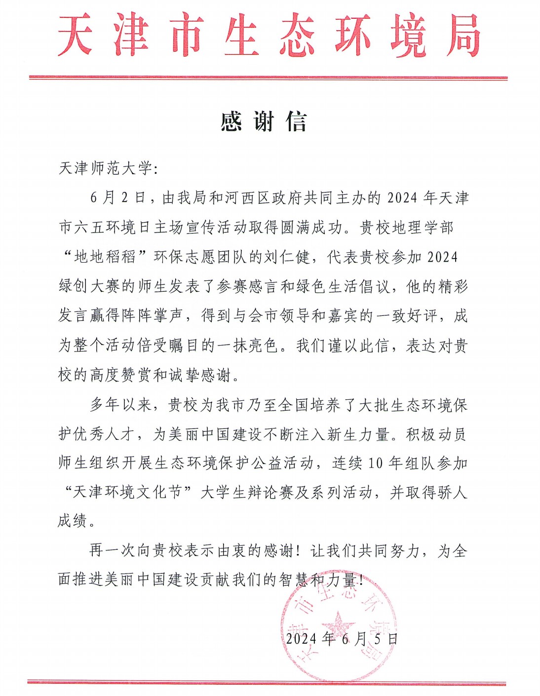 信中提到,在2024年天津市六五环境日主场宣传活动中,地理学部“地地稻稻”环保志愿团队的刘仁健,代表太阳城参加2024绿创大赛的师生发表了参赛感言和绿色生活倡议,得到与会市领导和嘉宾的一致好评。多年来,太阳城集团官方网站为我市乃至全国培养了大批生态环境保护优秀人才,积极动员师生组织开展生态环境保护公益活动,连续10年组队参加“天津环境文化节”大学生辩论赛及系列活动,并取得骄人成绩。特此对刘仁健同学提出表扬,并向太阳城集团官方网站表示由衷的感谢。