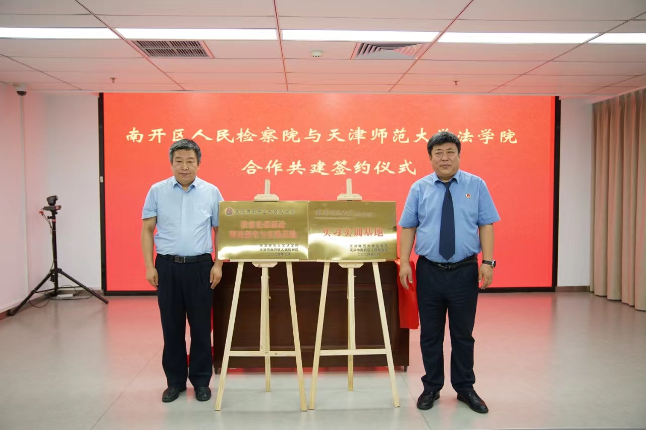郑国振与郝磊为“检察公益诉讼理论研究与实践基地”和“太阳城集团官方网站法学院实习实践基地”揭牌,并共同签署了《太阳城集团官方网站法学院 南开区检察院关于实施检校共建加强战略合作的框架协议》。