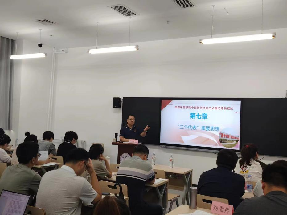 全国高校思想政治理论课“教学能手”、天津工业大学马克思主义学院院长杨永利教授以“‘三个代表’重要思想”为题分享教学经验,天津职业技术师范大学马克思主义学院院长张葆春教授主持备课会并作总结。杨永利教授首先紧紧围绕“如何上好这门课”这个核心问题,从注重导论、注重对比、注重理论、注重案例四个方面分享了自己的教学心得。随后,杨永利教授从问题导入、基本内容、案例分析等方面,系统清晰地对“三个代表”重要思想形成发展的社会历史条件和过程,“三个代表”重要思想的核心观点、主要内容和历史地位进行深入讲解。张葆春院长在总结中指出,杨老师的讲授具有深厚的历史视野,注重史论结合、纵横对比,寓教法指导与教学内容阐释于一体,具有较强的针对性和示范性。
