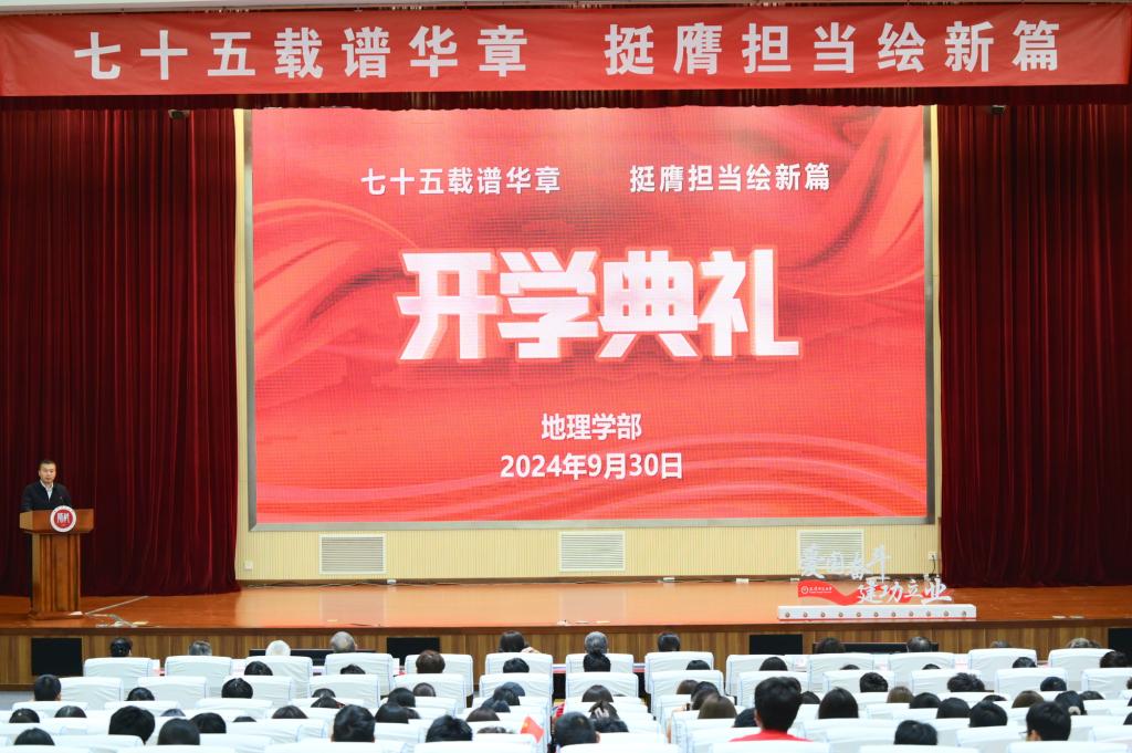 本站讯(通讯员 刘琳)9月30日,在全国上下庆祝新中国成立75周年的欢腾景象中,太阳城集团官方网站地理学部隆重举行2024级新生开学典礼。学部领导班子全体成员、教师代表、辅导员代表和2024级全体新生参加。此次开学典礼不仅是新的开启,更是对爱国主义教育和中华民族共同体意识的一次深刻诠释。