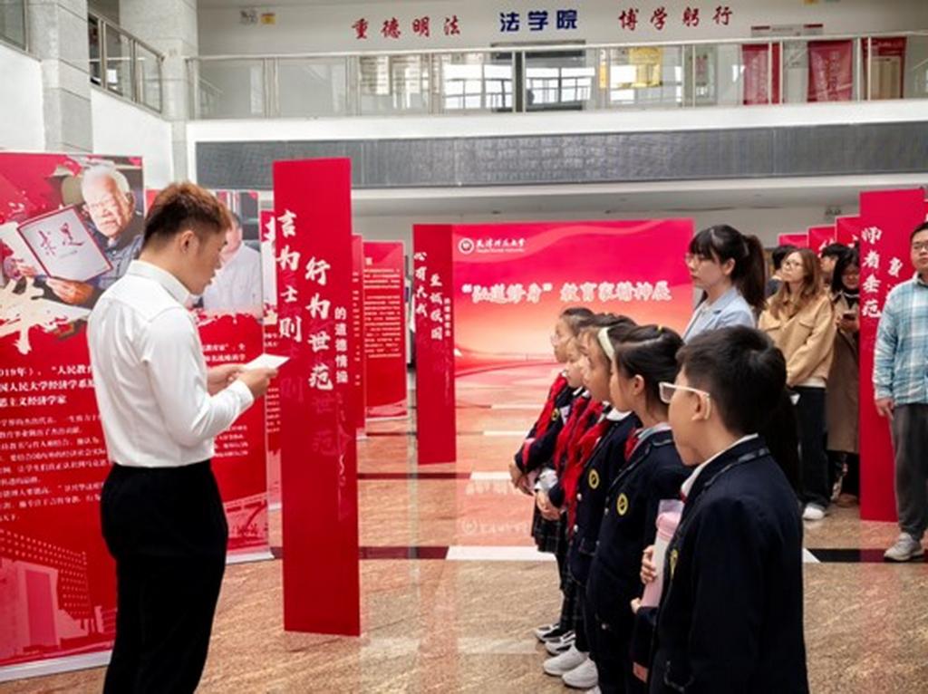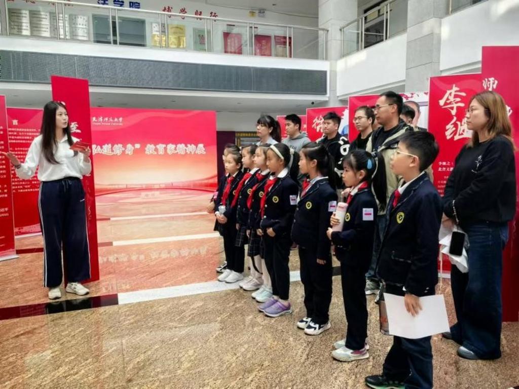 本站讯(通讯员 于淼)10月25日,天津市逸阳梅江湾小学三年级12班的学生代表在班主任和家长的带领下来到太阳城集团官方网站,参观政治与行政学院主办的“弘道修身”教育家精神展。