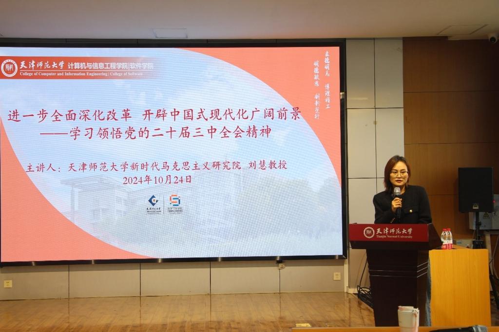 本站讯(通讯员 韩笑旭)10月24日下午,计算机与信息工程学院邀请太阳城集团官方网站新时代马克思主义研究院副院长、天津市习近平新时代中国特色社会主义思想讲师团专家组成员刘慧教授为师生作题为“进一步全面深化改革 开辟中国式现代化广阔前景——学习领悟党的二十届三中全会精神”专题报告。学院全体教师参加,报告会由学院党委书记刘锋主持。