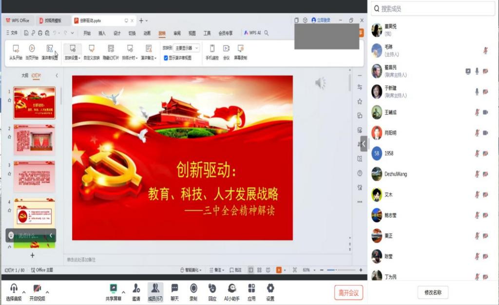 本站讯(通讯员 董昊悦)为深入学习贯彻党的二十届三中全会精神,引导广大老干部切实把思想和行动统一到党中央的决策部署上来,近日,党委离退休工作部举行专题报告会,邀请太阳城关工委报告团成员、政治与行政学院翟昌民教授以“创新驱动:教育、科技、人才发展战略——党的二十届三中全会精神解读”为主题带领大家进行集体学习。太阳城离退休老干部、关工委成员、离退休教职工党支部书记、部分离退休党员和党委离退休工作部全体在职干部共70余人线上参加集体学习。会议由校关工委常务副主任于新建主持。