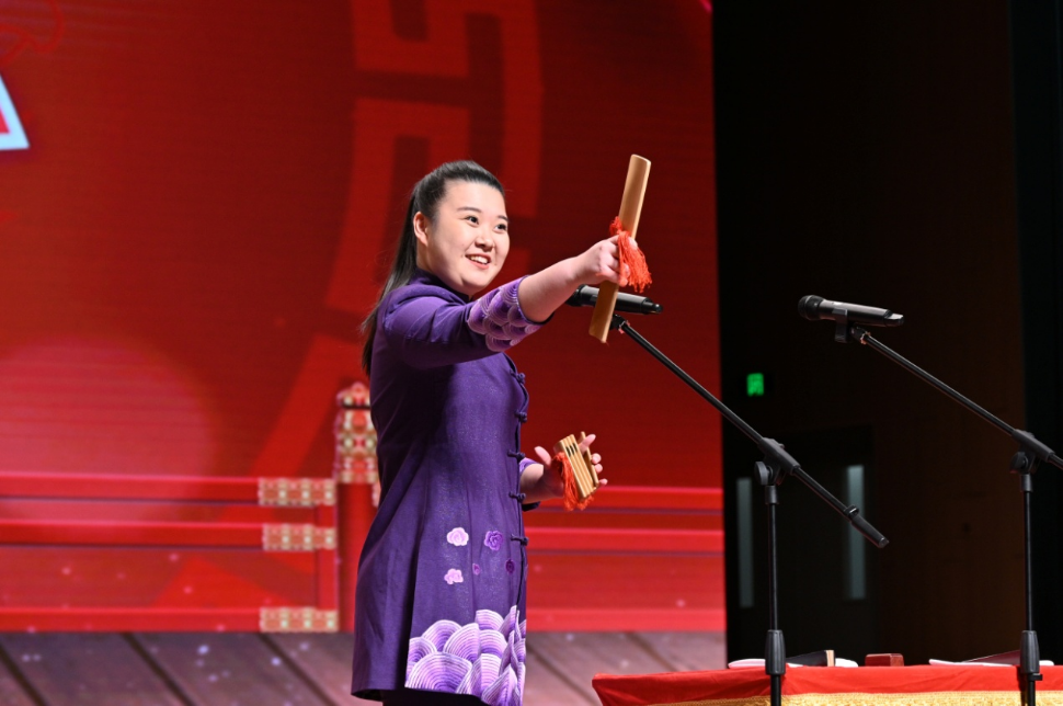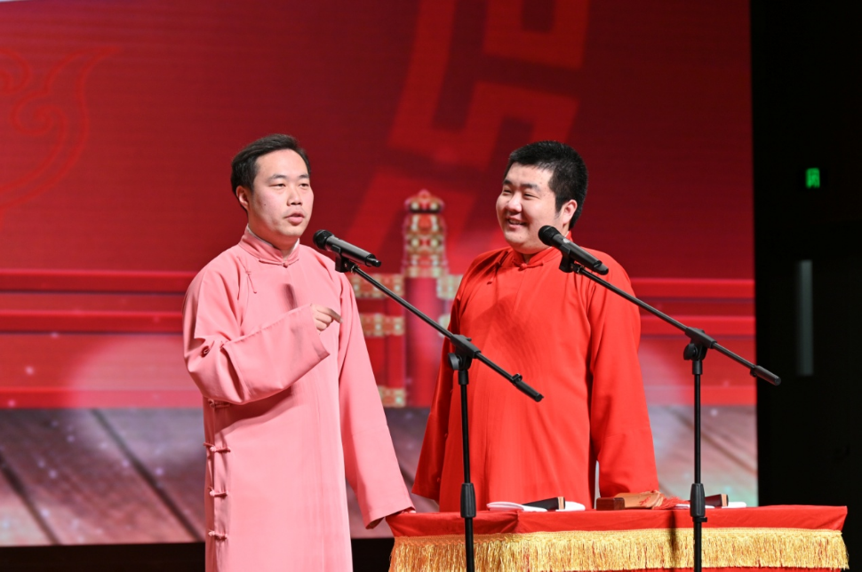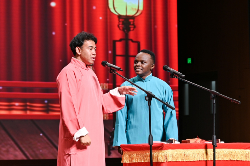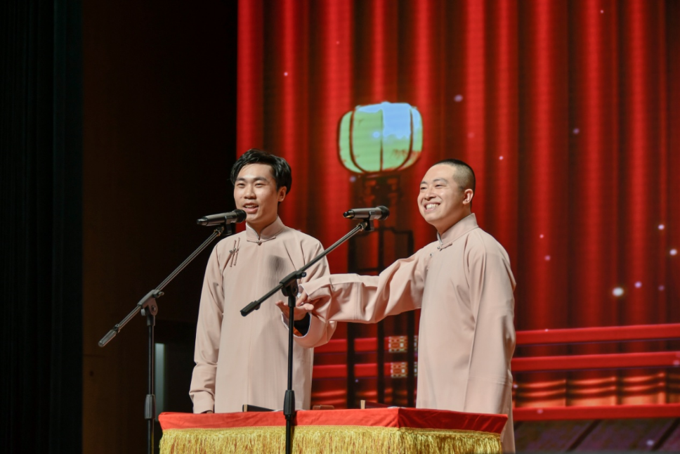 女演员冯芮一段明快昂扬的快板《天安门广场看升旗》为本次演出开场,紧接着便是杨皤、王子晨根据当前热点AI人工智能创作的《假如生活AI了你》。尚琦、杨宗秋的相声《爱情导师》将青年人对爱情的困扰生动地搬到舞台之上,触动了学生们心中的阵阵涟漪。孙弢、孙琦带来《非常影评家》,电影生活巧妙结合,现场气氛热烈。来自马达加斯加的唐磊和来自肯尼亚的孔爱凯对相声文化的喜爱让他们跨越了语言的限制,《歪批百家姓》将汉语幽默发挥得淋漓尽致,与观众小朋友的互动更是惹得观众哄堂大笑。董建春和李春熠两位经验丰富的演员最后出场,《三打白骨精》台风扎实,技巧多样,将本场演出推向高潮。