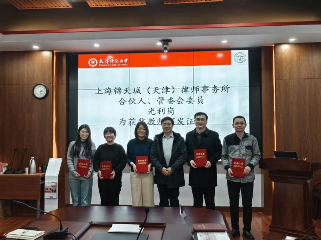 本站讯(通讯员 侯慧秀)1月7日,法学院“锦天城”奖教金颁奖仪式在学院澍泽报告厅举行。上海锦天城(天津)律师事务所合伙人、管委会委员光利岗、王腾燕律师,法学院领导班子全体成员、全体教师参加颁奖仪式。