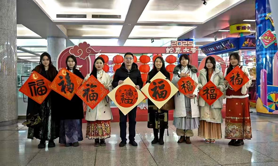 带队教师任海澜老师介绍到:“组织学生参与春运送福活动,是学院积极推动校企合作,强化教学实践,增强美育教育和拓展学生就业渠道的重要环节。通过送福这一传统习俗,学生们将饱含祝福与美好的书法作品传递给返乡旅客,不仅营造了浓厚的节日氛围,更在实践中深化了对传统文化的理解与传承,提升了自身的审美素养与人文情怀,同时也为学生们提供了走出校园融入社会的实践平台,帮助他们尽早树立正确的就业择业观念。非常感谢天津轨道交通运营集团提供这样难得的机会。”