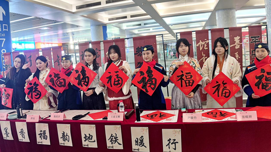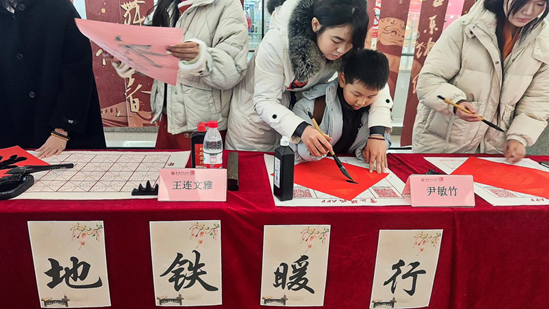 “同书奋进篇,同享乐华年。”天津师大美术与设计学院的学生们以笔为媒,将传统节庆文化融入车站。一时间,墨香混着年味飘散。借助地铁站点平台,这份传承千年的文化,正一路驶向四方,传递新春祝福。