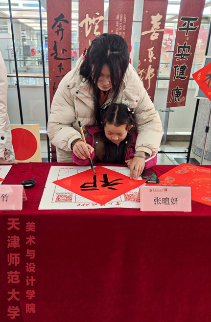 在天津站地下一层津门岗旁,参与活动的学生们铺开大红宣纸,饱蘸浓墨,笔锋游走间,或苍劲有力、或飘逸灵动的书法作品跃然纸上。一个个饱含吉祥寓意的“福”字,一副副承载美好愿景的春联,在他们笔下诞生。