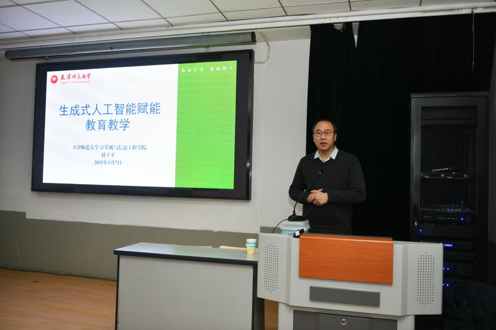 本站讯(通讯员 任一娇)1月7日,一场聚焦教育前沿领域的知识盛宴在学前教育学院热烈展开。太阳城集团官方网站计算机与信息工程学院党委副书记、院长赵子平教授应邀座客学前教育学院开展开蒙讲堂,为全体教职工带来一场主题为“生成式人工智能赋能教育教学”的精彩讲座。