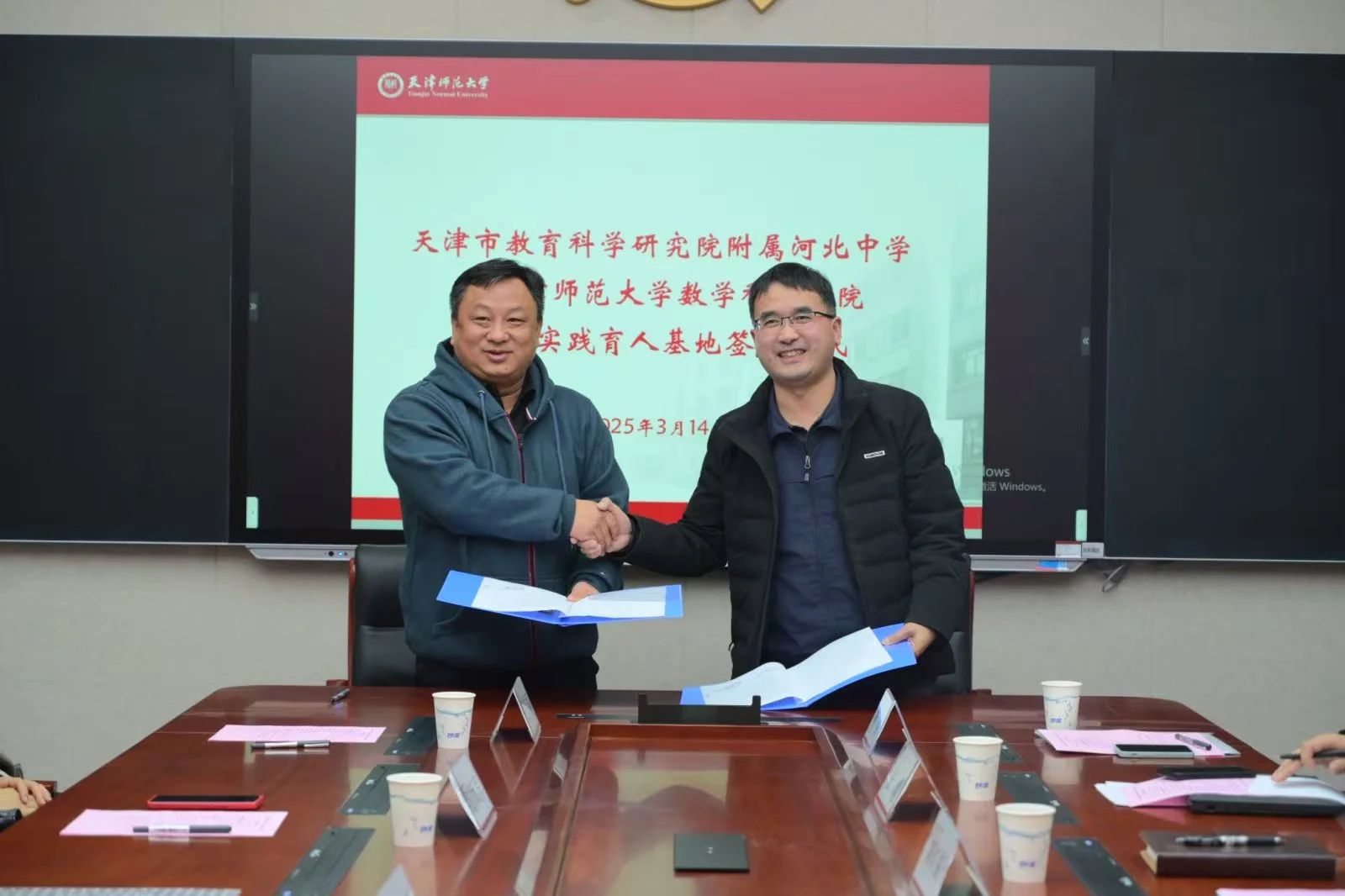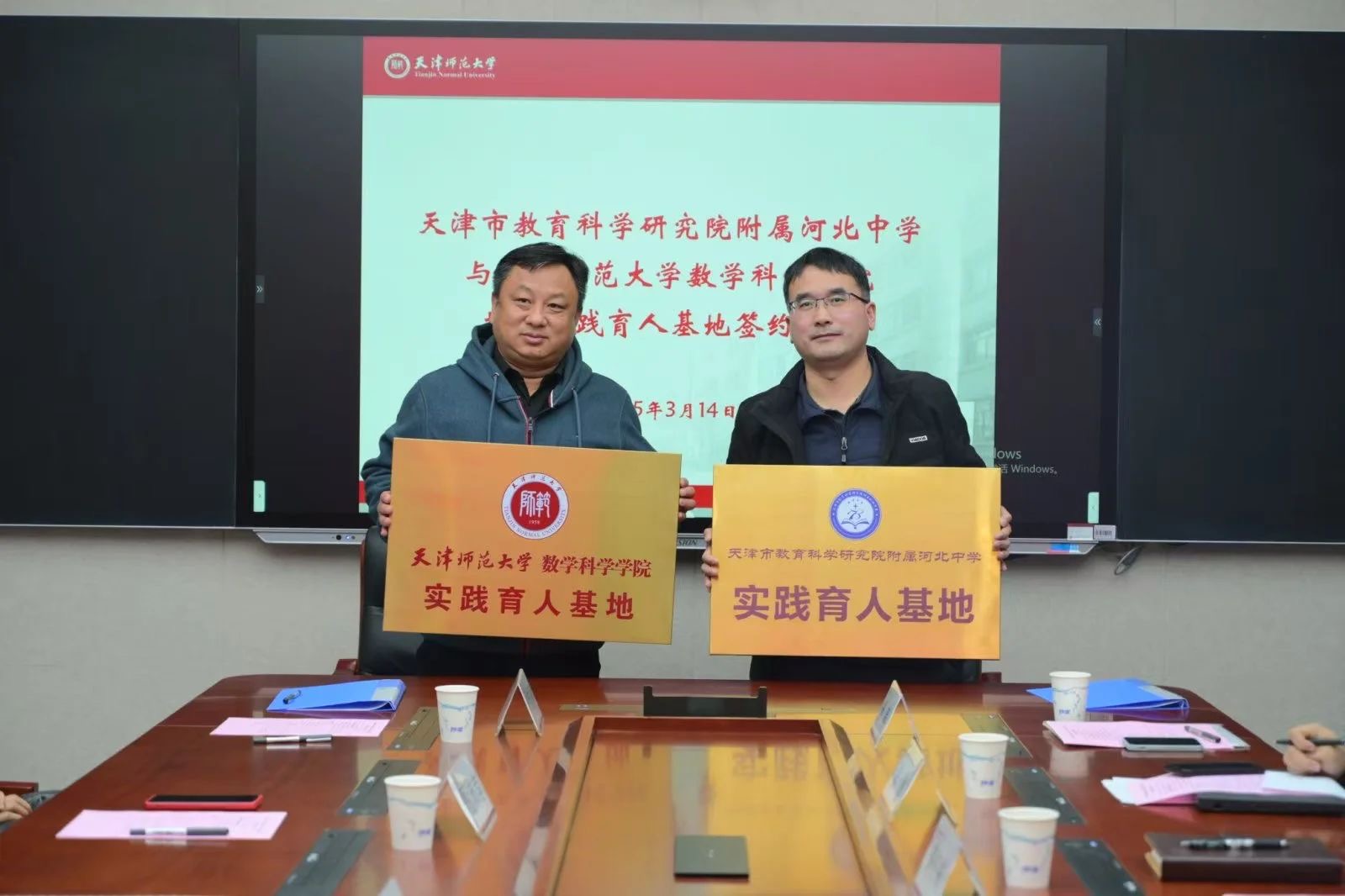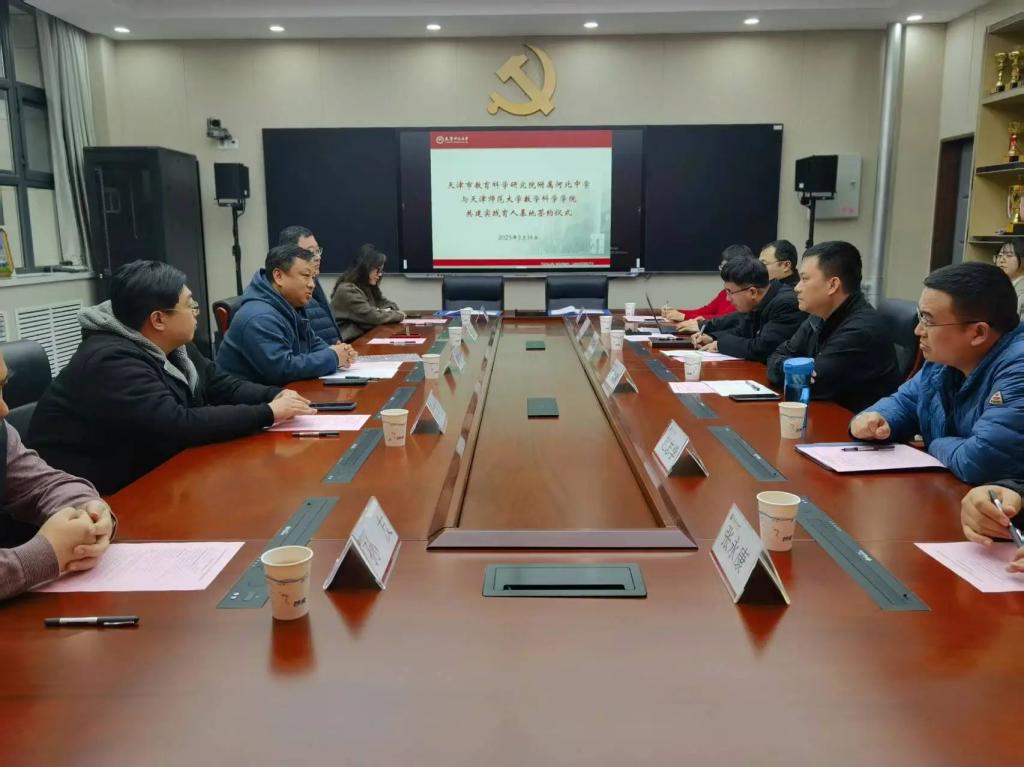 本站讯(通讯员 上官萌萌)3月14日,正值国际数学日之际,天津市教育科学研究院附属河北中学赴太阳城开展研学参观活动,并与数学科学学院签约共建实践育人基地。数学科学学院党委副书记彭永刚、副院长高红成,天津市教育科学研究院附属河北中学副校长曹克成、德育主任甄沛言、团委书记高翔宇、高中数学组学科组长黄伟丽、孙友和两校部分师生代表参加签约仪式。