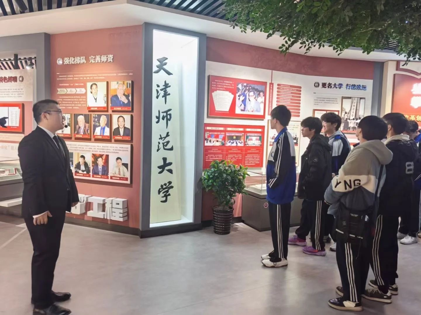 签约仪式前,数学科学学院志愿者带领天津市教育科学研究院附属河北中学师生参观校史馆与生态记忆馆。通过图文资料与实物展品,师生们深入了解学校历史沿革、学科特色及办学成就,深刻感受教育家精神传承,进一步激发学习热情与社会责任感。