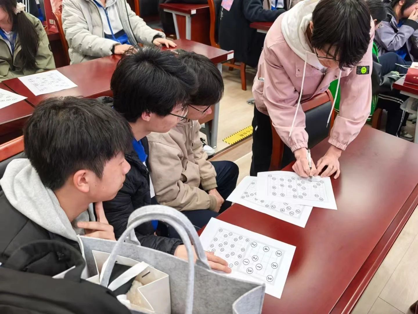 在数学建模实验室中,同学们通过数学软件操作将抽象公式转化为几何图形,结合生活案例开展量化分析,培养逻辑思维与数学审美能力。随后开展的“益智数学闯关”活动,通过莫比乌斯带制作、数独游戏、扑克牌速算等互动环节,将数学原理融入趣味实践。志愿者团队还与中学生围绕生涯规划展开深度交流,帮助学生明确目标方向。