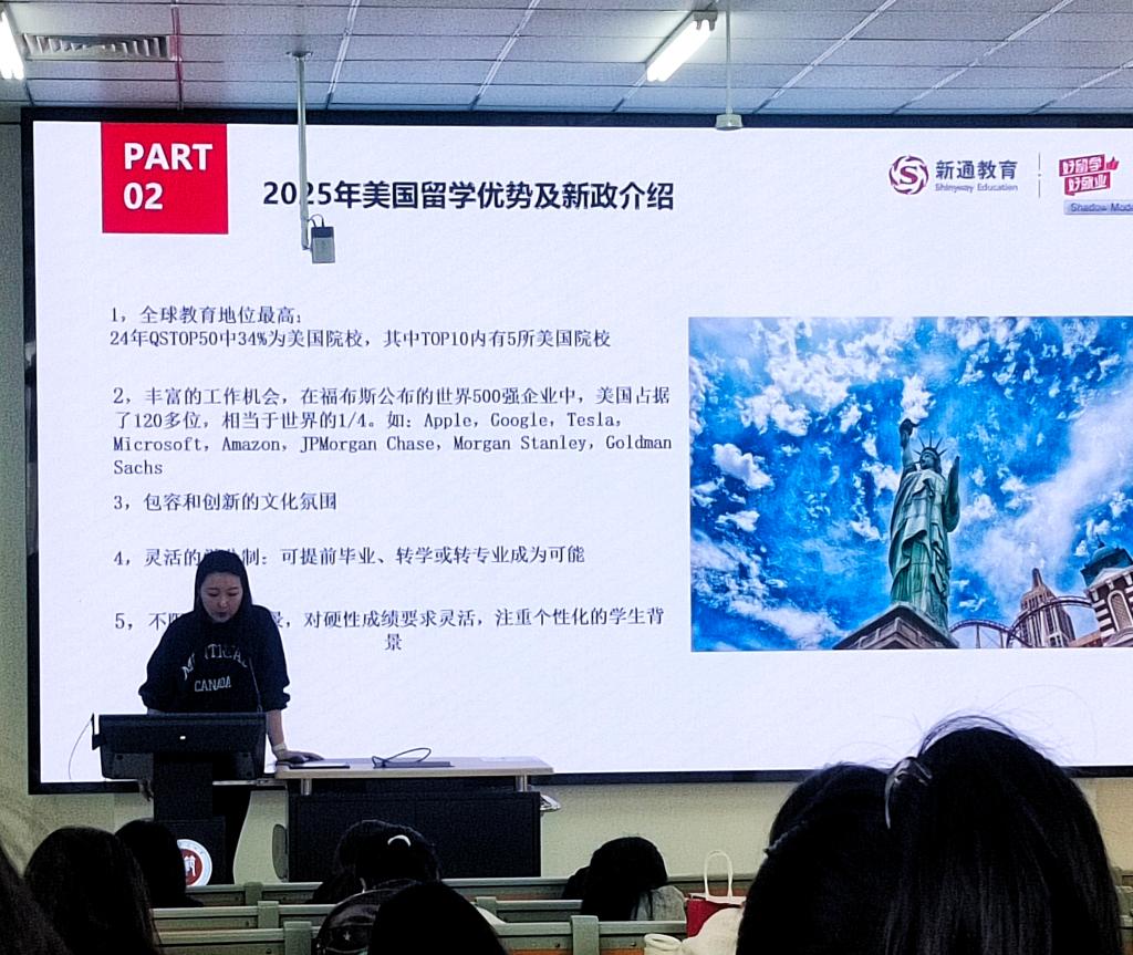 新通教育吴巍老师主要围绕考研后的留学方向和科学规划留学计划两大方面展开。依据国内考研和境外升学数据表以及教育部等部门的相关文件,从国内外考研难度、考研时间、考研费用和考研院校排名等角度,进行了深入解读。以国际比较视角展现境外读研的弯道超车机遇,结合美加名校案例解码申请策略,倡导学子以全球胜任力应对人才竞争新格局。