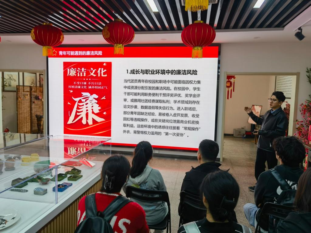 活动伊始,徐芃泽老师以“青春有为 廉洁有我”为主题讲授廉洁团课。作为天津市“青廉宣讲团”成员,他结合党的二十大报告中“青年强,则国家强”的嘱托,通过三组对比展开教学。在讲座中,他系统解读习近平总书记对青年“扣好人生第一粒扣子”的殷切期望,梳理《中国共产主义青年团章程》中的纪律要求;剖析近年来高校青年团员违纪典型案例,结合数学学科发展史中“陈省身拒绝国际数学联盟不当经费”等学界轶事,阐明“学术诚信与廉洁精神同源”;设置“当科研诚信与利益诱惑冲突时如何抉择”情景模拟,教育引导学生如何树立正确的世界观、人生观、价值观,坚定理想信念做新时代有为青年。